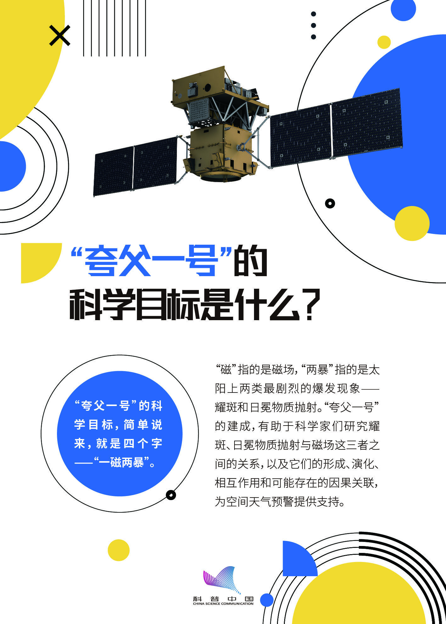 “夸父一号“是我国首颗综合性太阳探测专用卫星。“夸父一号”的建成,有助于科学家们研究耀斑、日冕物质抛射与磁场这三者之间的关系,以及它们的形成、演化、相互作用和可能存在的因果关联,为空间天气预警提供支持。