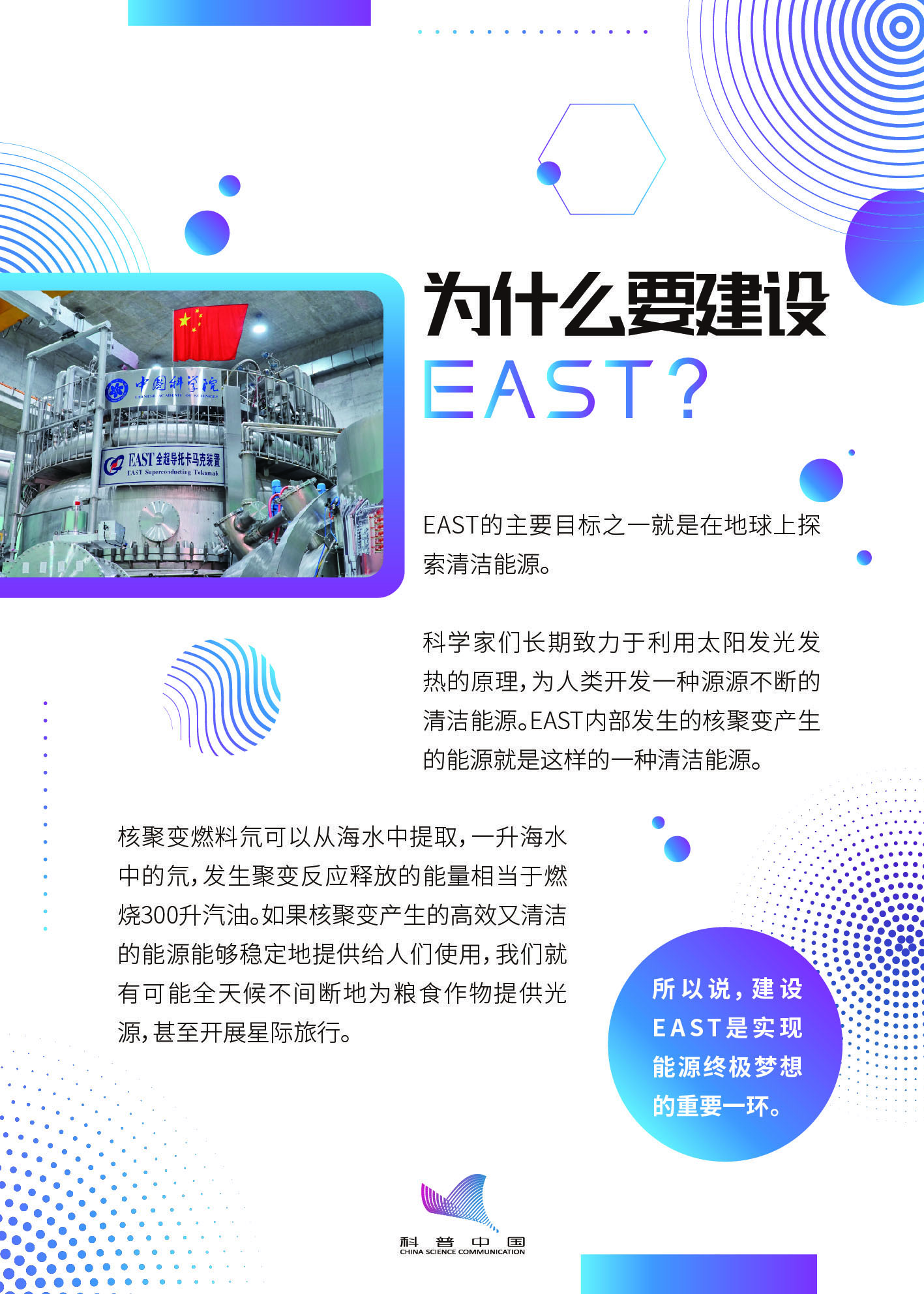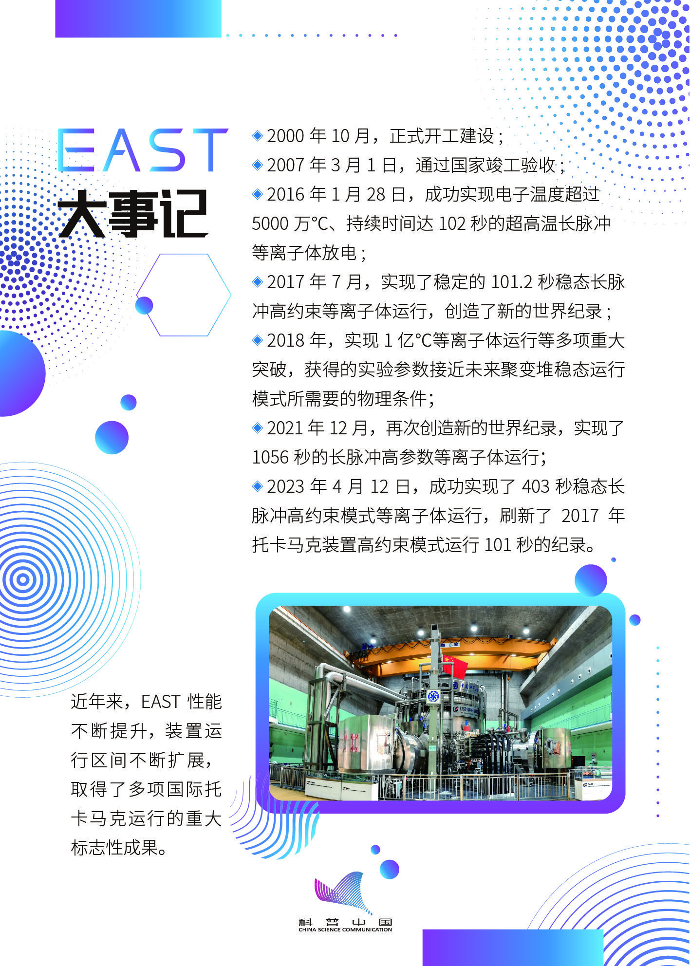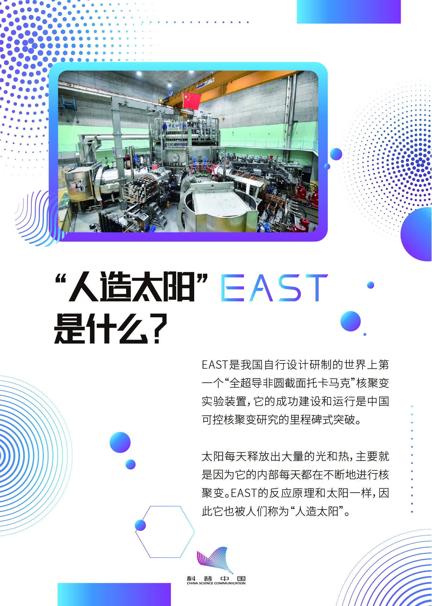 EAST是我国自行设计研制的世界上第一个“全超导非圆截面托卡马克”核聚变实验装置,它的成功建设和运行是中国可控核聚变研究的里程碑式突破。