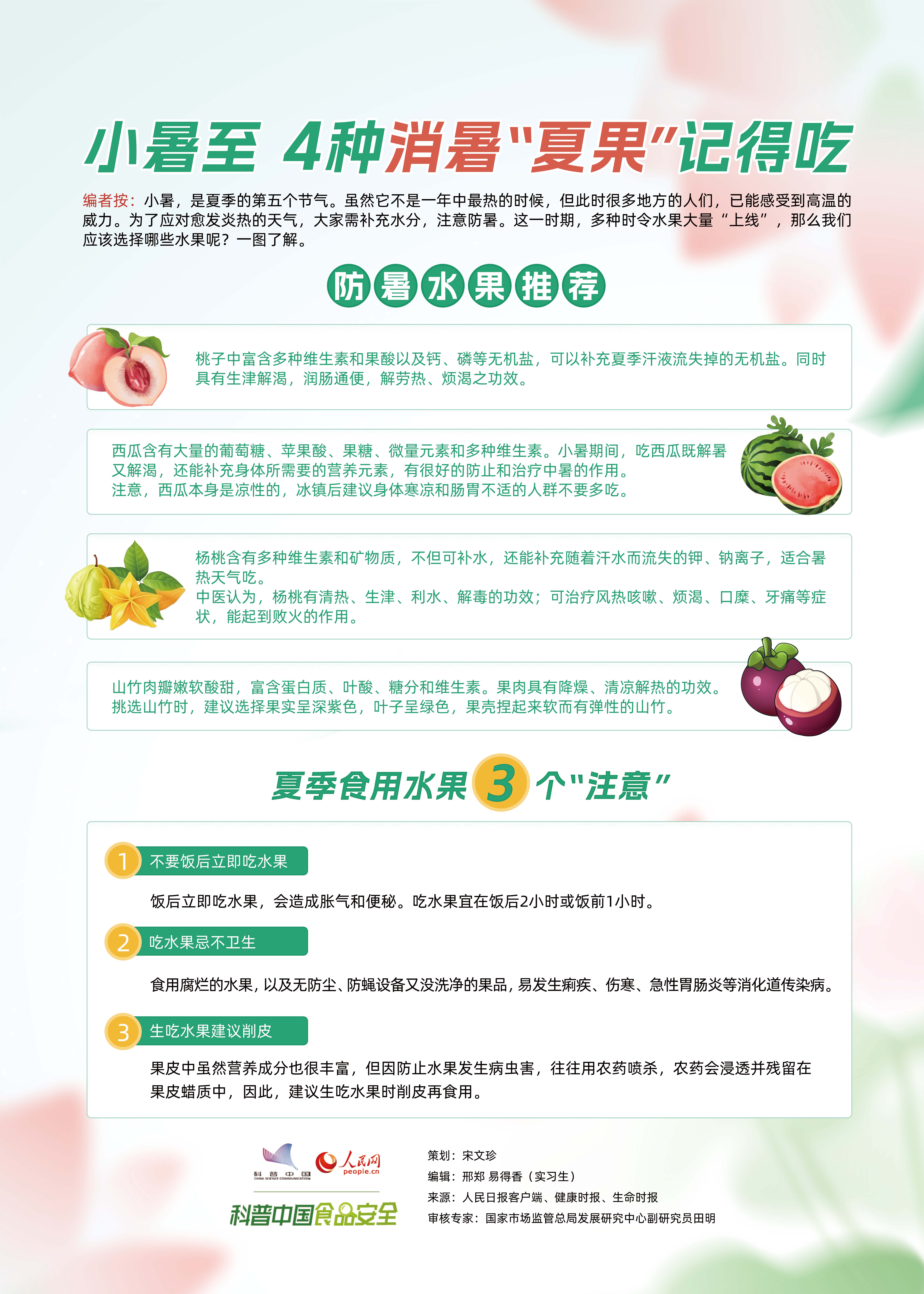 小暑,是夏季的第五个节气。虽然它不是一年中最热的时候,但此时很多地方的人们,已能感受到高温的威力。为了应对愈发炎热的天气,大家需补充水分,注意防暑。这一时期,多种时令水果大量“上线”,那么我们应该选择哪些水果呢? 一图了解。