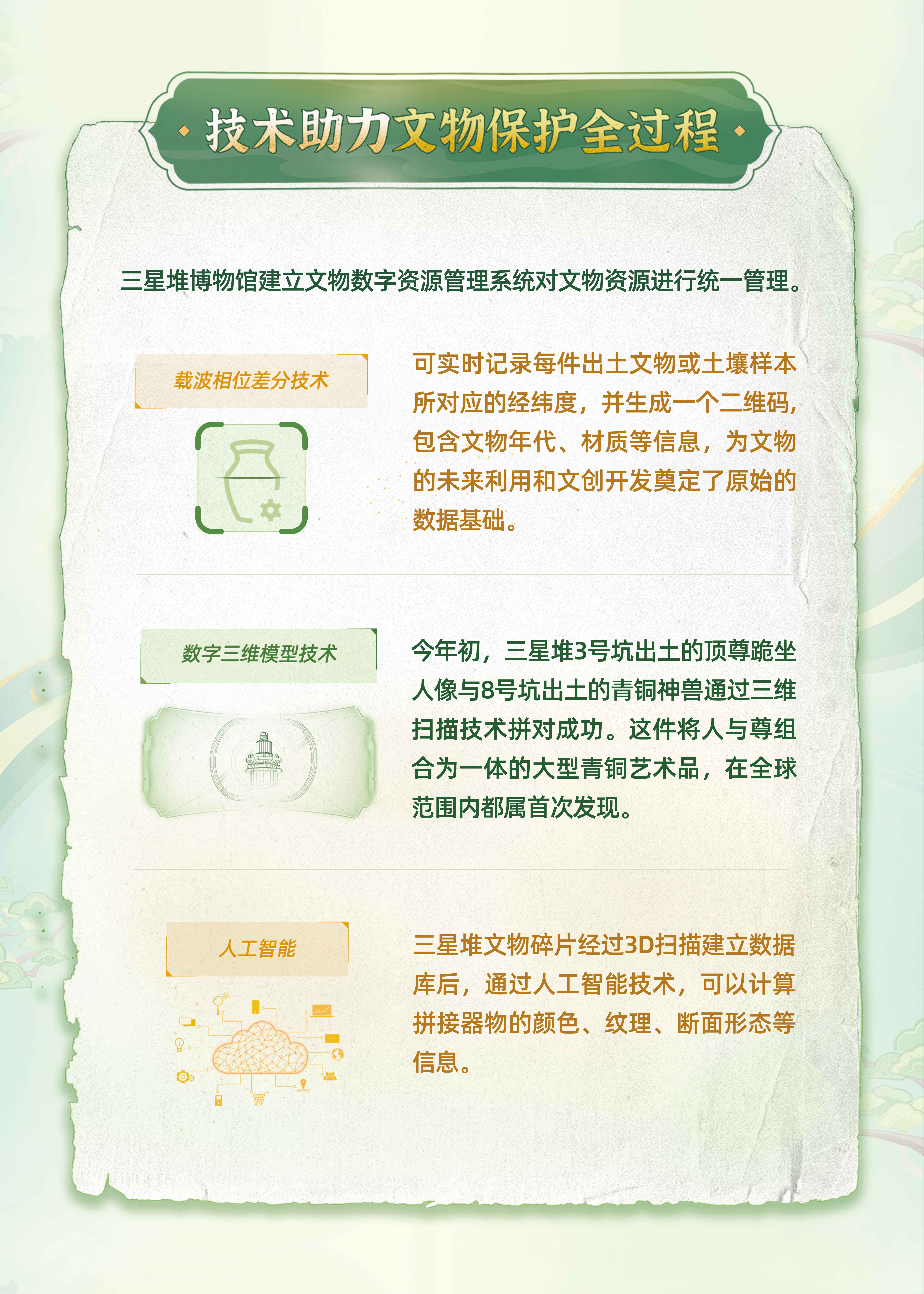 近年来,三星堆博物馆持续发力文化数字化,从古代到当代,从地下到“云端”,科技赋能历史文物,不断丰富和拓展文物保护利用的广度与深度,让古老的三星堆文化插上数字化翅膀。