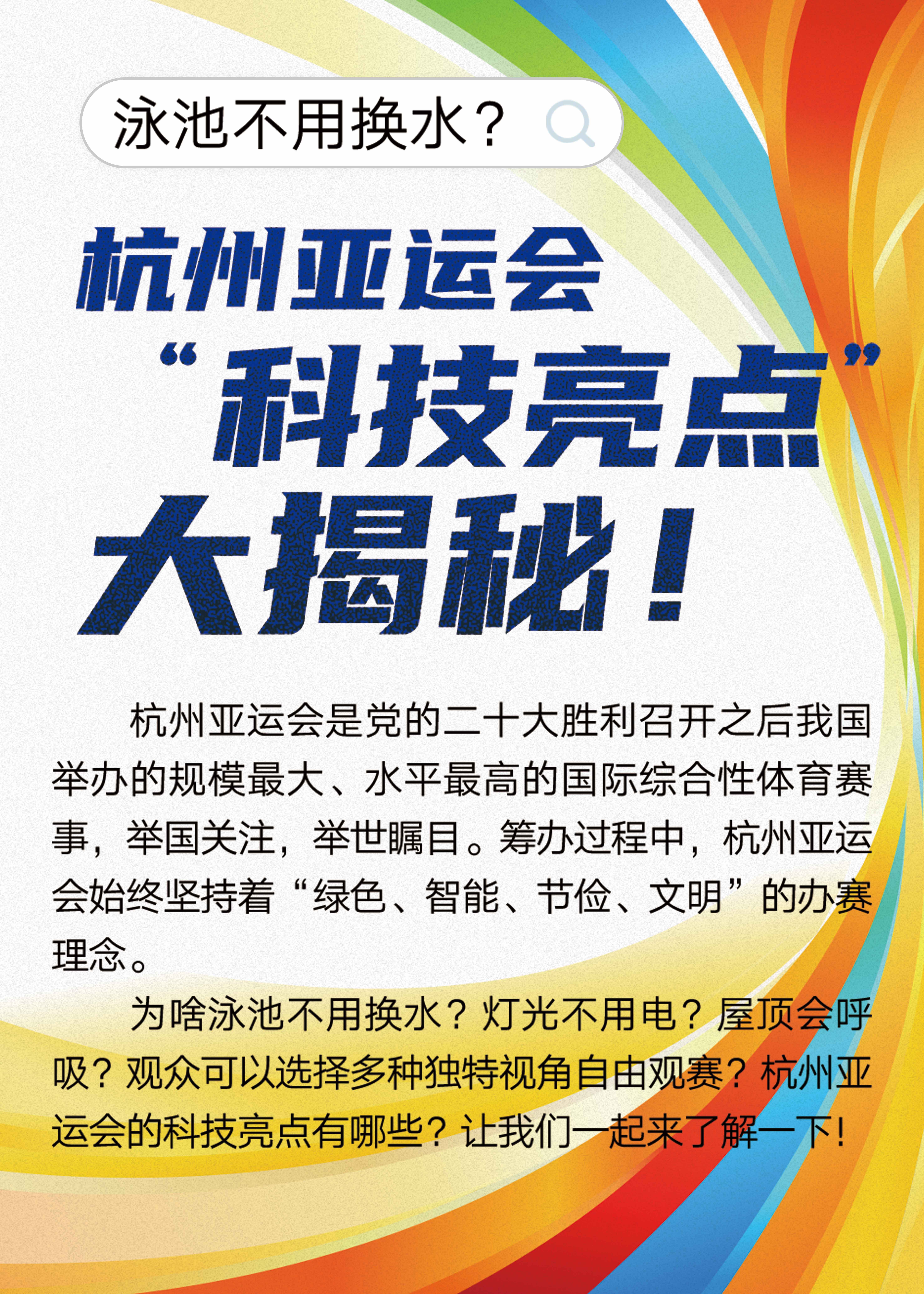 杭州亚运会是党的二十大胜利召开之后我国举办的规模最大、水平最高的国际综合性体育赛事,举国关注,举世瞩目。筹办过程中,杭州亚运会始终坚持着“绿色、智能、节俭、文明”的办赛理念。为啥泳池不用换水?灯光不用电?屋顶会呼吸?观众可以选择多种独特视角自由观赛?杭州亚运会的科技亮点有哪些?让我们一起来了解一下!