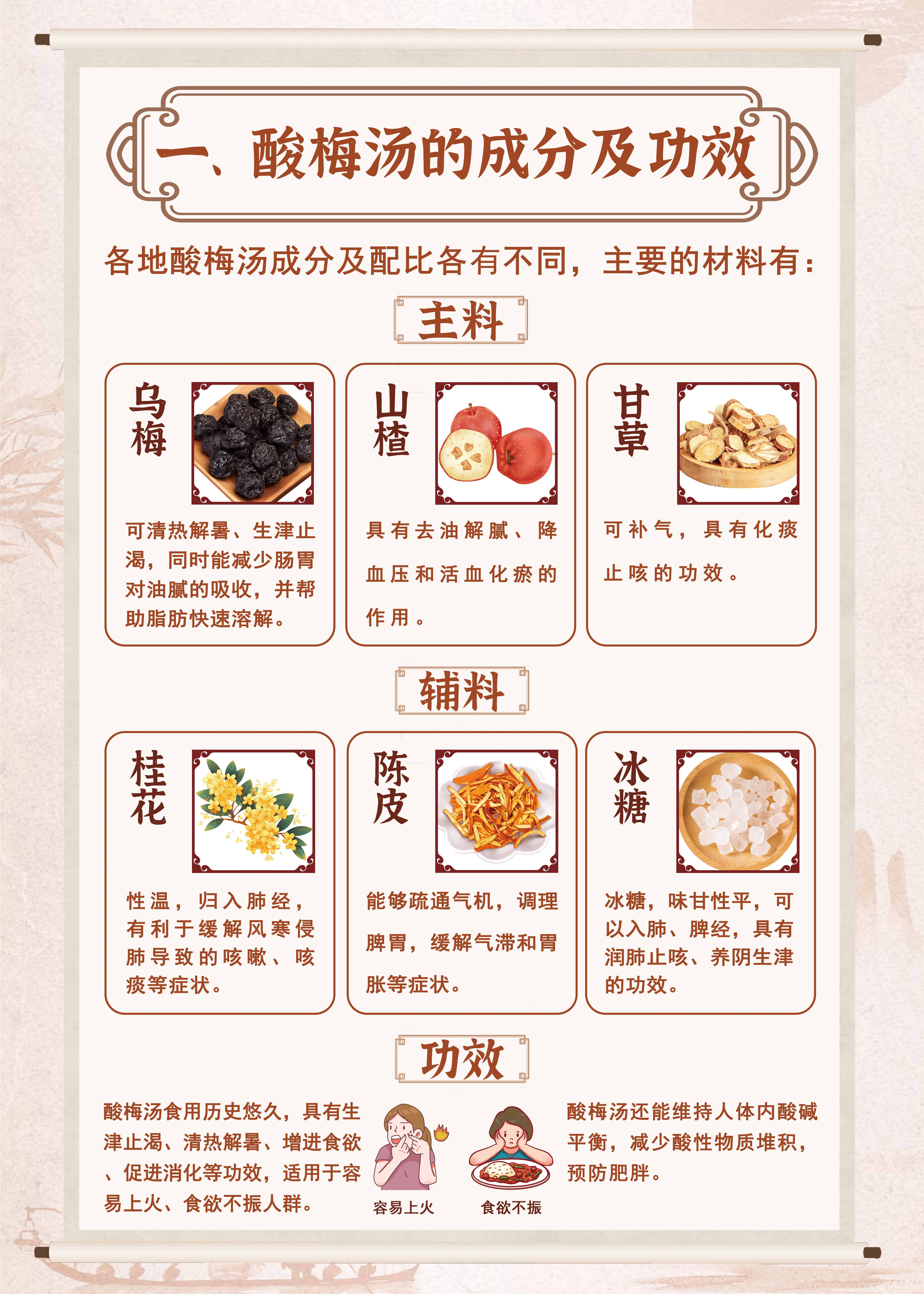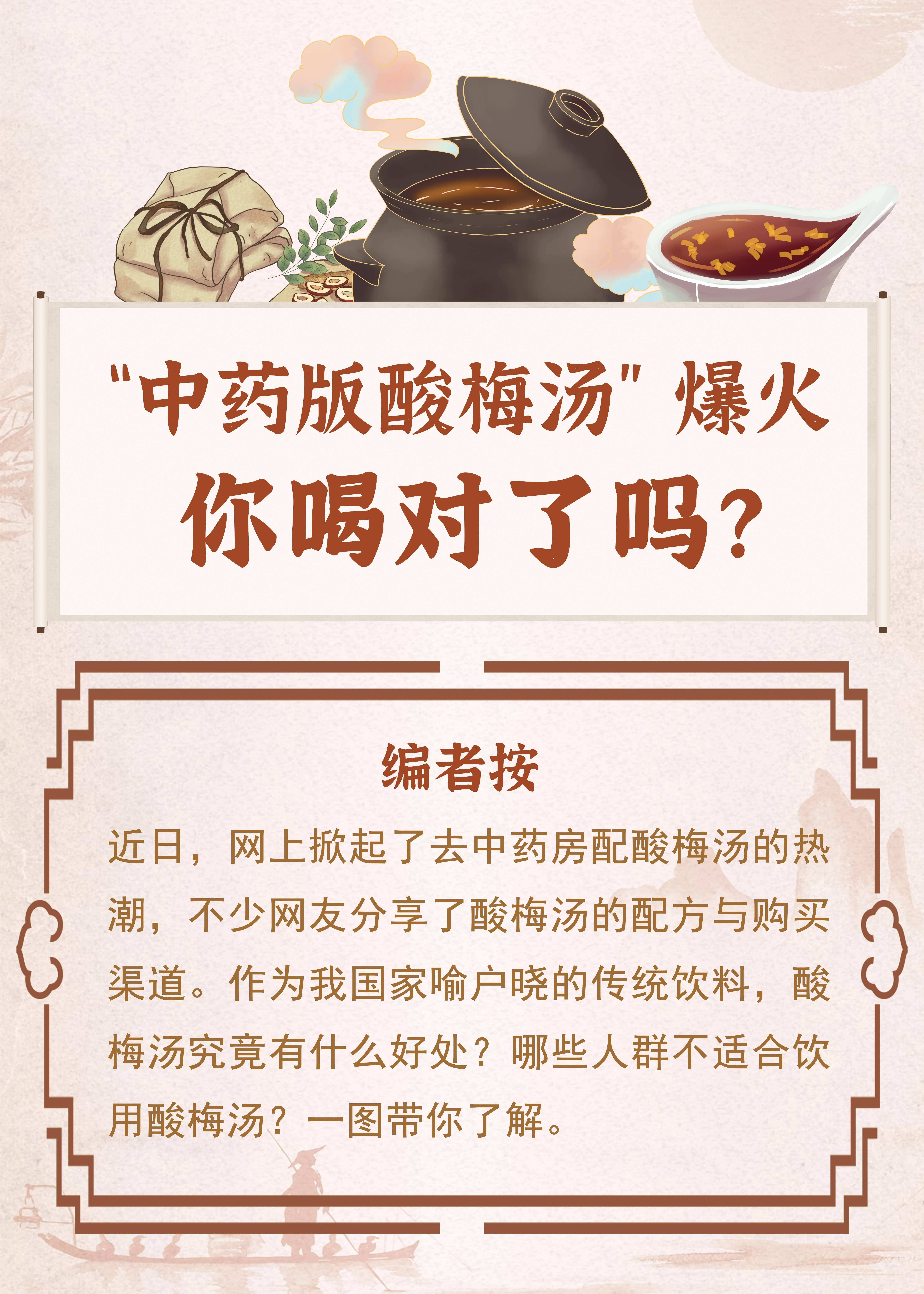 近日,网上掀起了去中药房配酸梅汤的热潮,不少网友分享了酸梅汤的配方与购买渠道。作为我国家喻户晓的传统饮料,酸梅汤究竟有什么好处?哪些人群不适合饮用酸梅汤?一图带你了解。