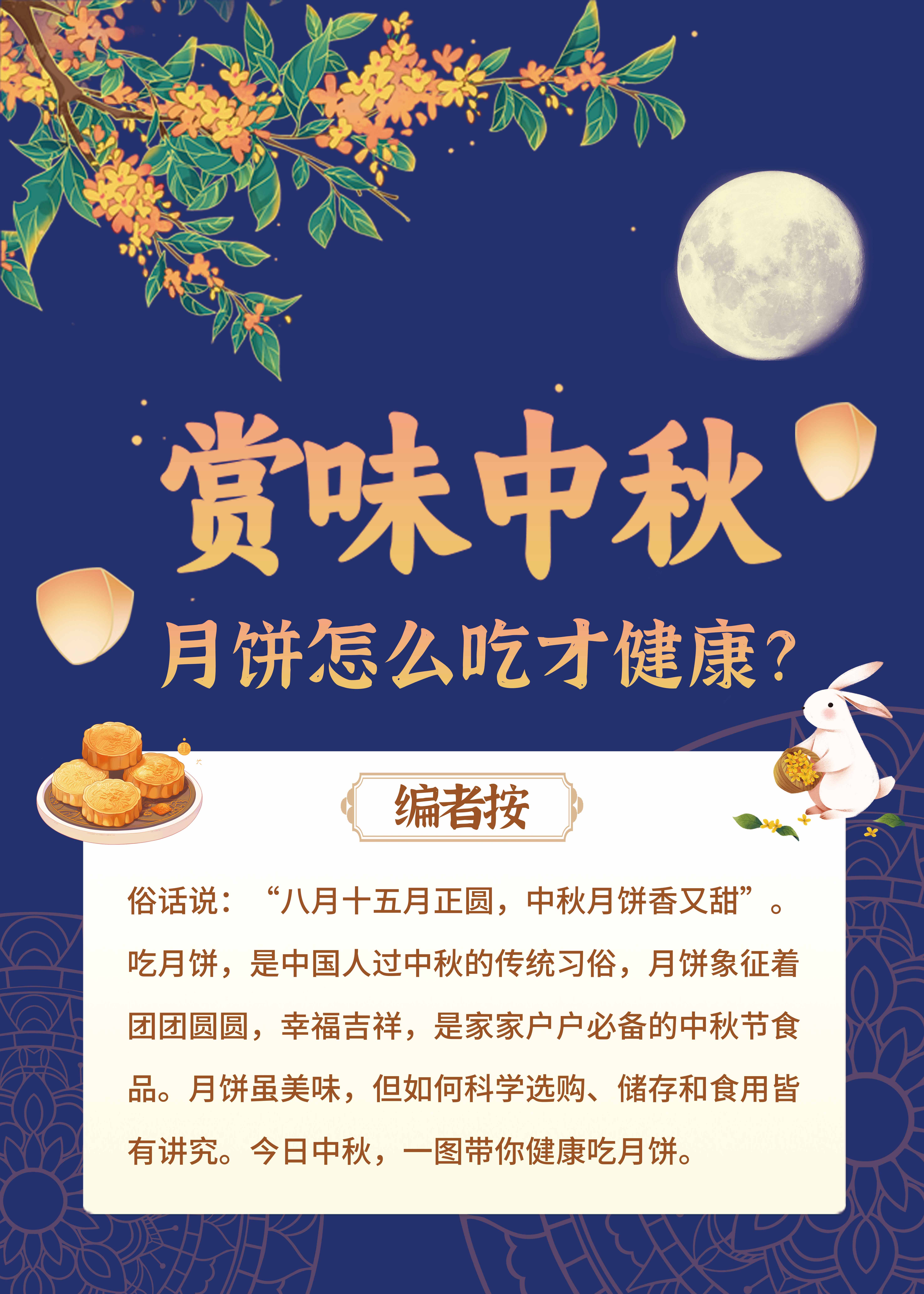 俗话说“八月十五月正圆,中秋月饼香又甜”吃月饼,是中国人过中秋的传统习俗,月饼象征着团团圆圆,幸福吉祥,是家家户户必备的中秋节食品。月饼虽美味,但如何科学选购、储存和食用皆有讲究,一图带你健康吃月饼。