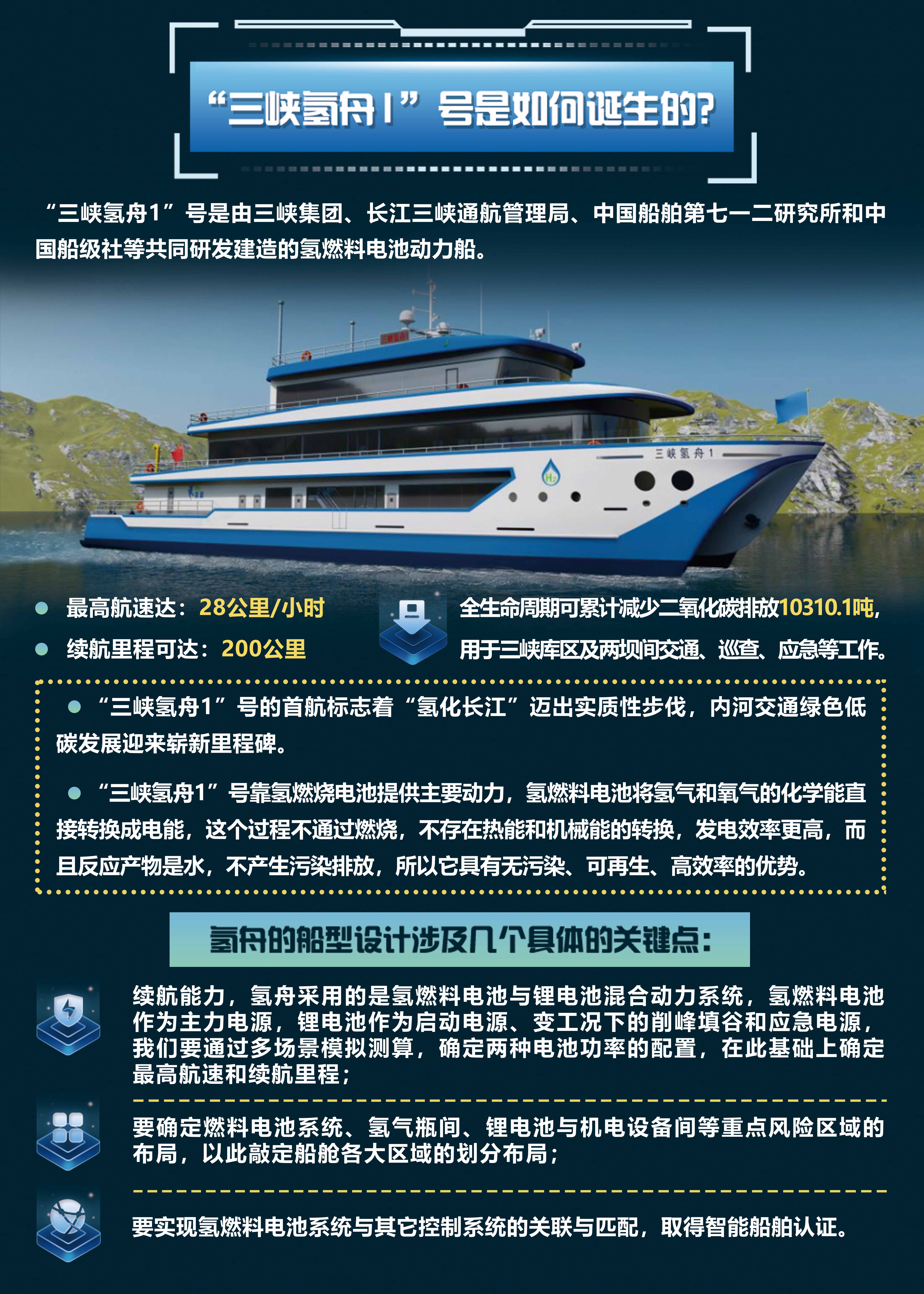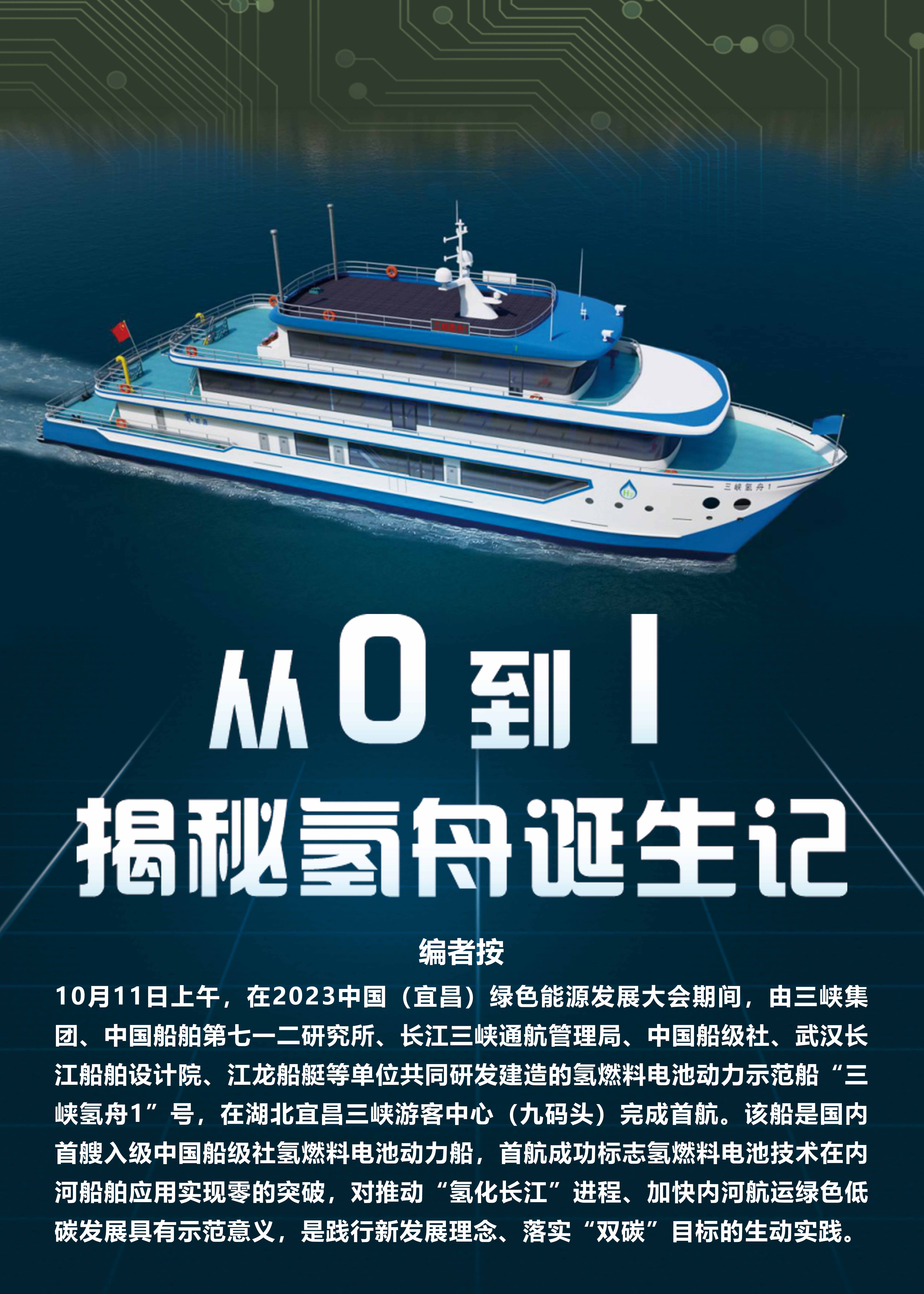 10月11日上午,在2023中国(宜昌)绿色能源发展大会期间,由三峡集团、中国船舶第七一二研究所等单位共同研发建造的氢燃料电池动力示范船“三峡氢舟1”号,在湖北宜昌三峡游客中心(九码头)完成首航。