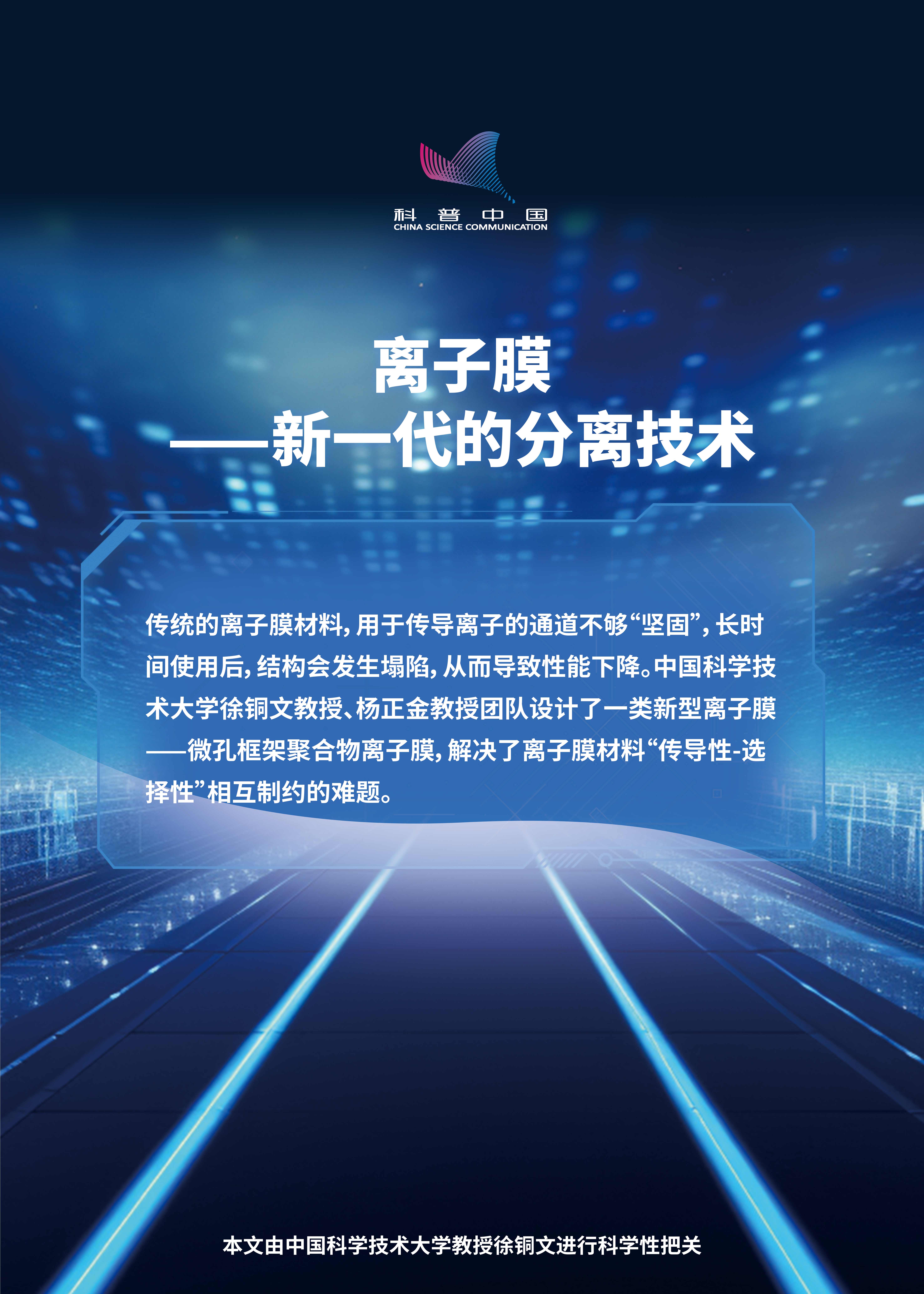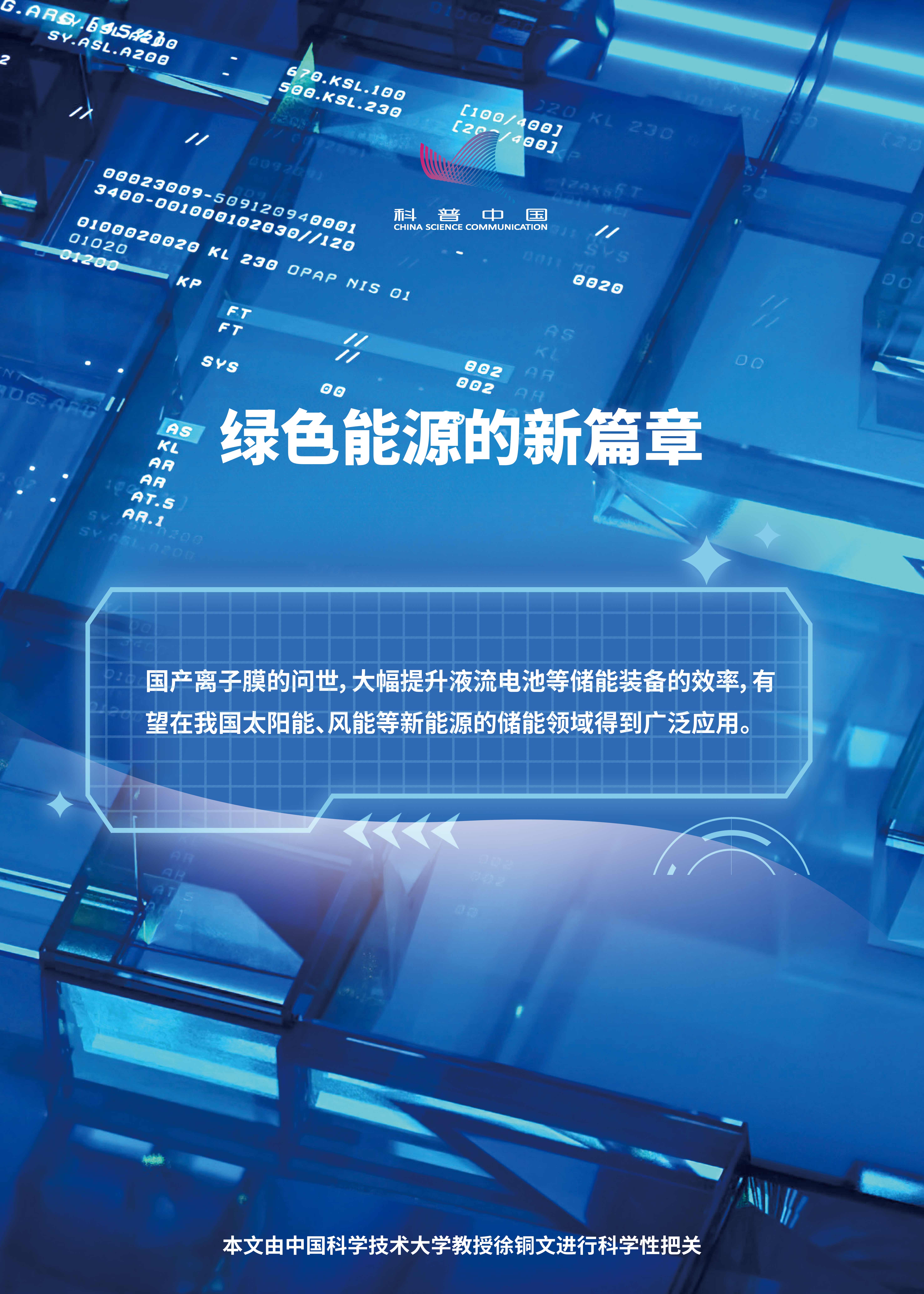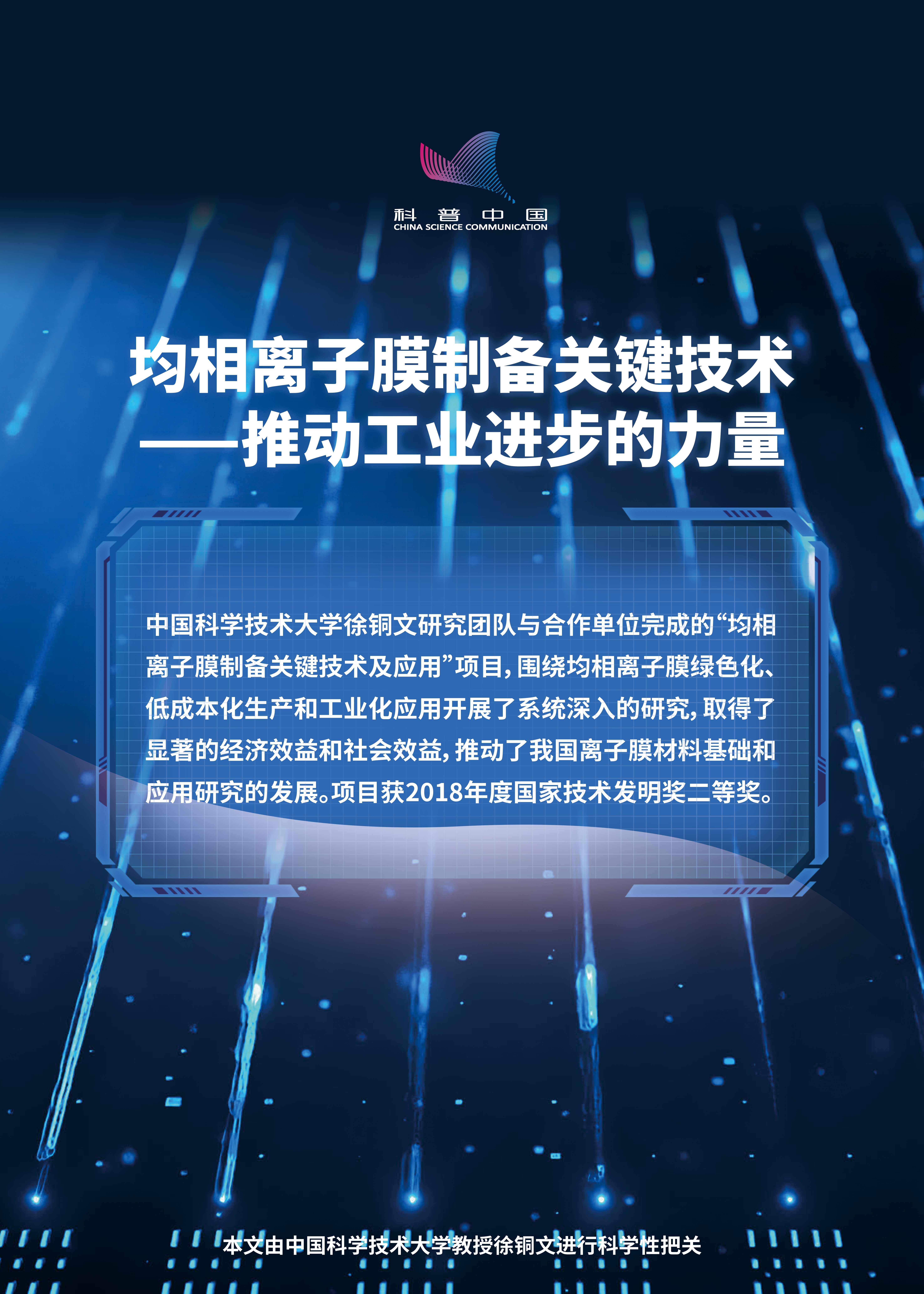 中国科学技术大学徐铜文研究团队与合作单位完成的“均相离子膜制备关键技术及应用”项目,围绕均相离子膜绿色化、低成本化生产和工业化应用开展了系统深入的研究,取得了显著的经济效益和社会效益,推动了我国离子膜材料基础和应用研究的发展。