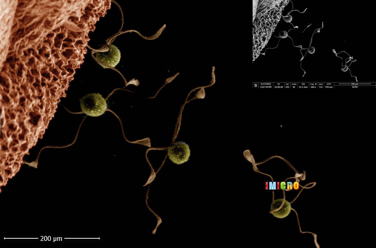 木贼(Equisetum hyemale)孢子囊成熟开裂,深绿色的孢子蹦跳着弹出来,所有孢子的大小和形状相同,圆球形的孢子直径约42 μm,四条尖端扁平呈勺状的弹丝十字形着生。弹丝具水湿运动,发育早期弹丝卷曲,螺旋盘绕在孢子周围,一旦孢子成熟变干,这些弹丝不再卷曲,与其它孢子的弹丝缠绕在一起,助力孢子从孢子囊中成群扩散。这是一场渐行渐远的分离,新旅程开启新世代。