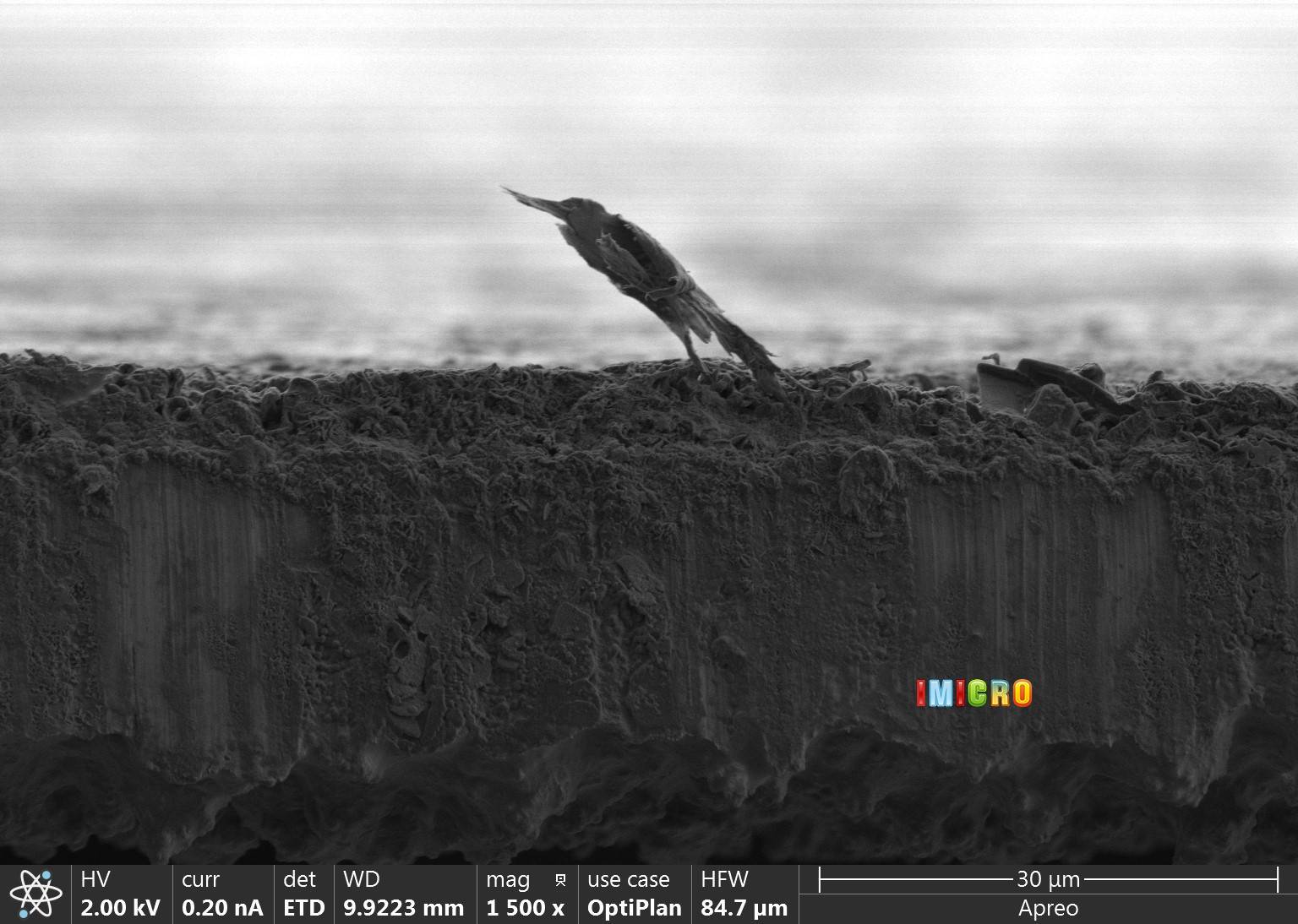 本作品呈现出的在低温下-30℃环境下沉积在铜基底上的金属锂,利用FEI Apreo电镜拍摄截面形貌。观察到样品表面存在一只体长约为20微米左右的鸟的形貌。该鸟站立在基底上,即便不对图片进行染色处理,依旧能够清晰分辨出鸟喙,翅膀,尾翼,脚,等部位。这应该是世界上最小的“鸟”了。