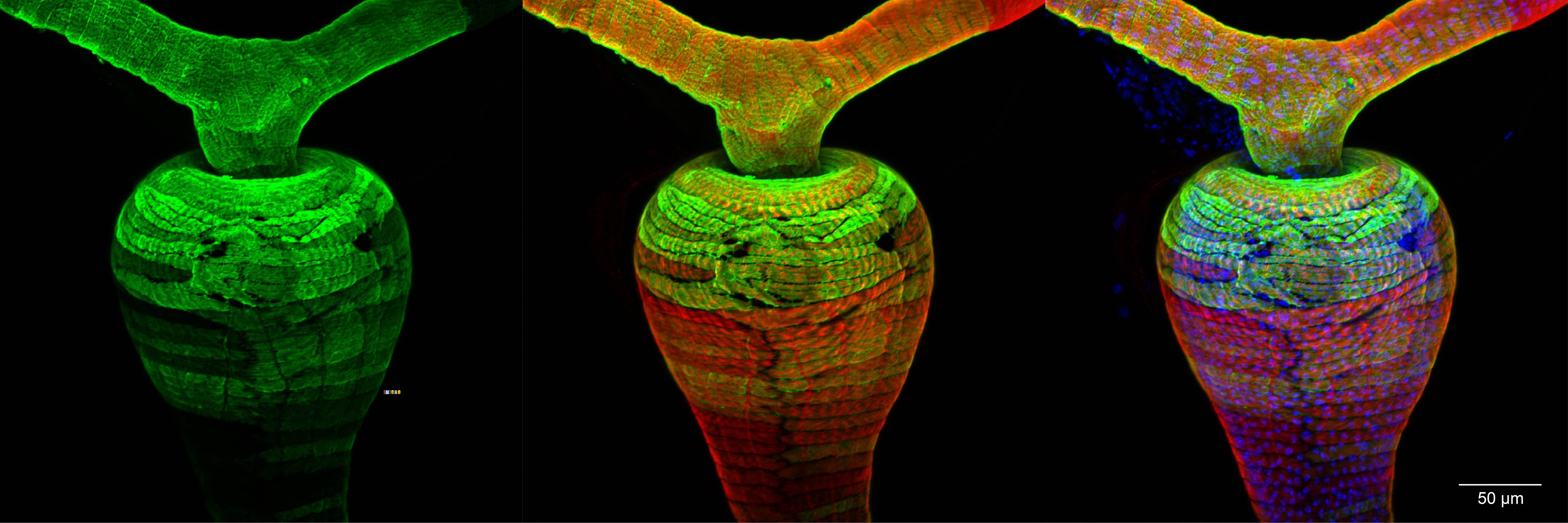这张照片展示了果蝇的前胃(proventriculus),一个在功能上类似于哺乳动物幽门的器官。在荧光蛋白GFP的绿色光芒、肌肉纤维的红色身影(鬼笔环肽染色)以及细胞核的蓝色星光(DAPI染色)的映衬下,前胃的形态显得格外优雅,其色彩斑斓的美感仿佛一件精心上色的彩陶艺术品,让人不禁为之着迷。