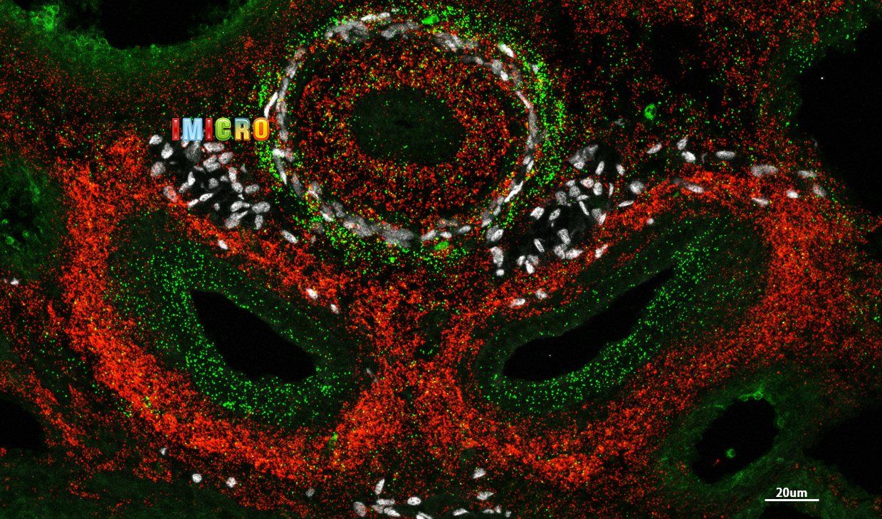 兰陵王,他的面具承载着神秘。面具上的斑点宛如岁月的痕迹,仿佛述说着无数战场上的征战岁月。微小的颗粒在面具表面凝聚,仿佛是历经沧桑的印记,勾勒出兰陵王传奇般的命运。整个作品透露着一种沉重的历史感,勾勒出兰陵王身上那份无法言喻的孤独与悲壮。这幅作品通过气管截面的Pdgfra和End3原位杂交染色以及Sox10免疫荧光染色,仿佛将兰陵王的精神面貌凝固在了时间的长河中,让观者仿佛能够窥见古代传奇的一丝风采