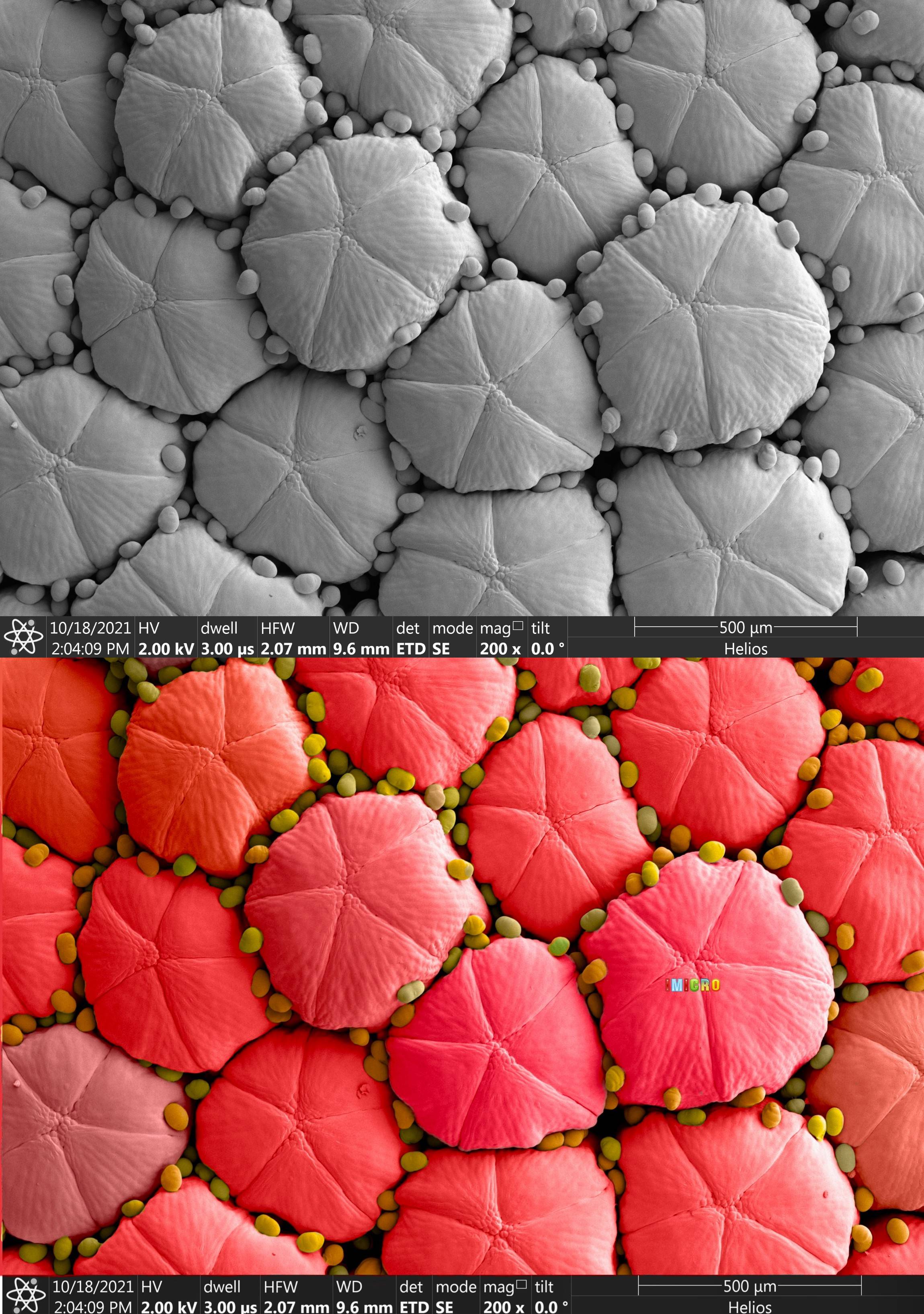电子显微镜就像一把钥匙,带领人们走进微观的世界。进入野生菊花的微观世界,感受到了生物电镜和中国传统文化相结合的魅力,整个画面犹如一盏盏的红色灯笼,热情似火,温暖人心。红灯笼是喜庆的象征,向人们传递幸福和光明。 本次实验的样品类型是菊花的花盘,使用的设备是FEI Helios Nanolab G3 UC,冷冻扫描方法成像,用procreate软件伪彩上色。本次实验可以观察野生菊花花盘位置的显微结构。