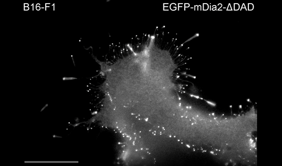 形成蛋白家族介导线性肌动蛋白丝的形成。过表达组成型活化的形成蛋白EGFP-mDia2-ΔDAD(Diaphanous Auto-inhibitory Domain)使B16-F1细胞边缘典型的Lamellipodia(片状伪足)消失,同时显著诱导出由线性肌动蛋白丝组成的Filopodia(指状伪足)结构。EGFP-mDia2-ΔDAD在末端的聚集使得Filopodia酷似在黑夜中飞舞的萤火虫。