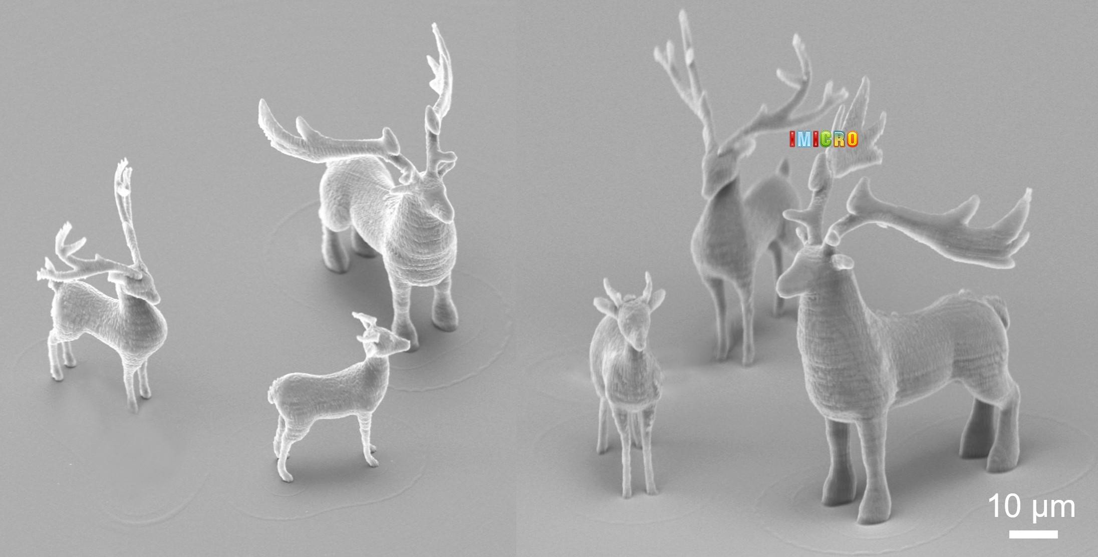 该作品是通过双光子聚合技术在SZ2080光刻胶中加工的几只微观小鹿,其特征尺寸在百纳米量级,每一只小鹿都惟妙惟肖,鹿角等细节清晰可辨。双光子聚合技术是一种强大的三维成型技术,可以灵活多变地加工出各种各样的三维微纳结构,被广泛地应用于细胞组织工程、微纳米光学、微纳米机械、微流体和超材料等领域。