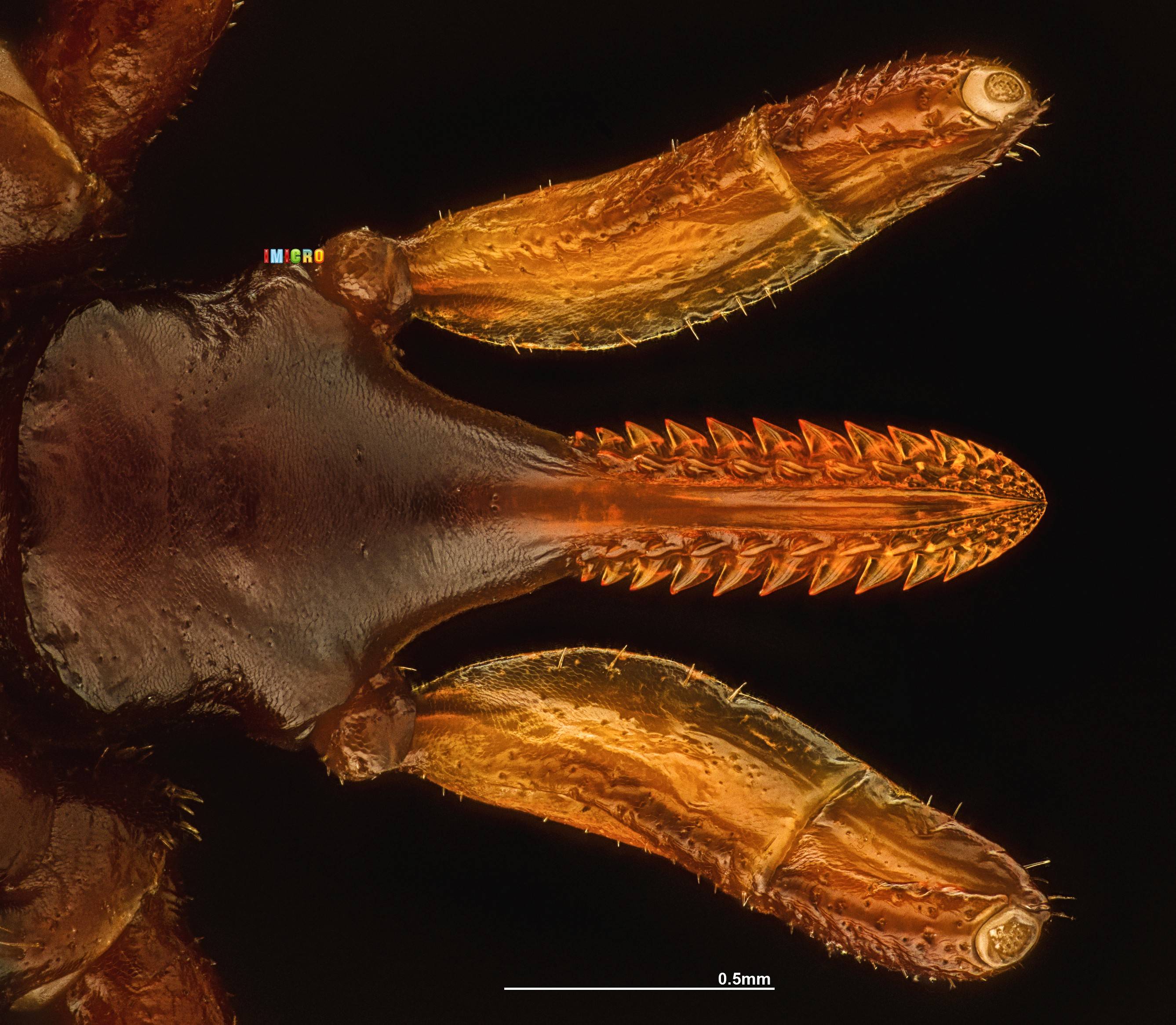 蜱是重要的医学害虫,可携带多种病原并通过叮咬吸血传播森林脑炎,莱姆病,蜱媒回归热等多种传染病。被蜱叮咬之后通常很难直接取下,这是因为蜱具有极为特化的口器,在叮咬动物的过程中,口器两侧的倒锯齿在动物皮肤中交替切割前进,最终牢牢嵌入皮肤中吮吸血液。 我们使用佳能5DMarkIV相机配合三丰10倍物镜镜头(Mitutoyo Plan NIR 10)自行搭建的超微距摄影系统,拍摄50张不同景深的相片叠加