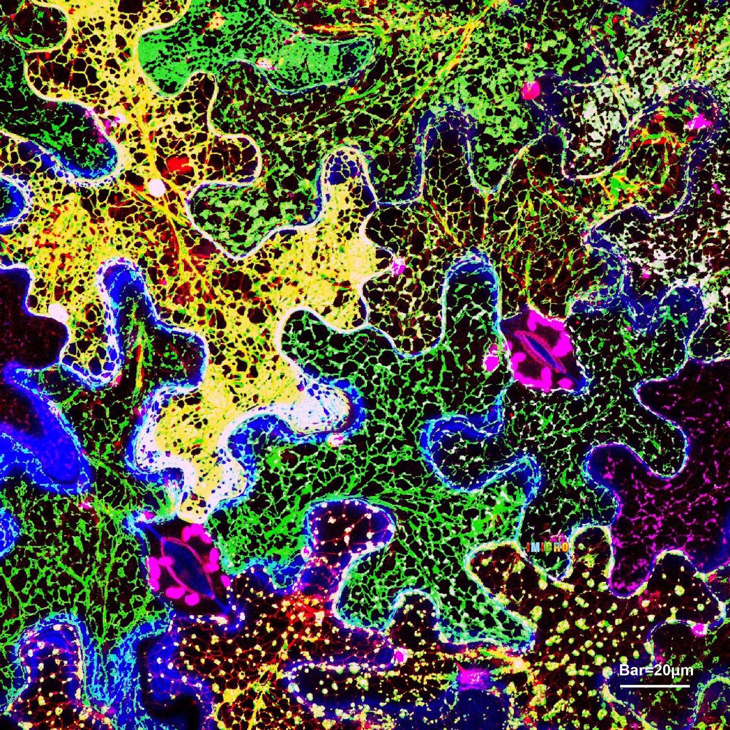 该作品采用多种特异性标记方法,联合Zeiss LSM880 Airyscan 超分辨共聚焦显微镜,在烟草(Nicotiana benthamiana)植物中瞬时表达后,进行活细胞成像和实时观察。该作品不仅提供了多种细胞器相互作用的展示图,同时也为植物活细胞多色成像提供一种技术支持。