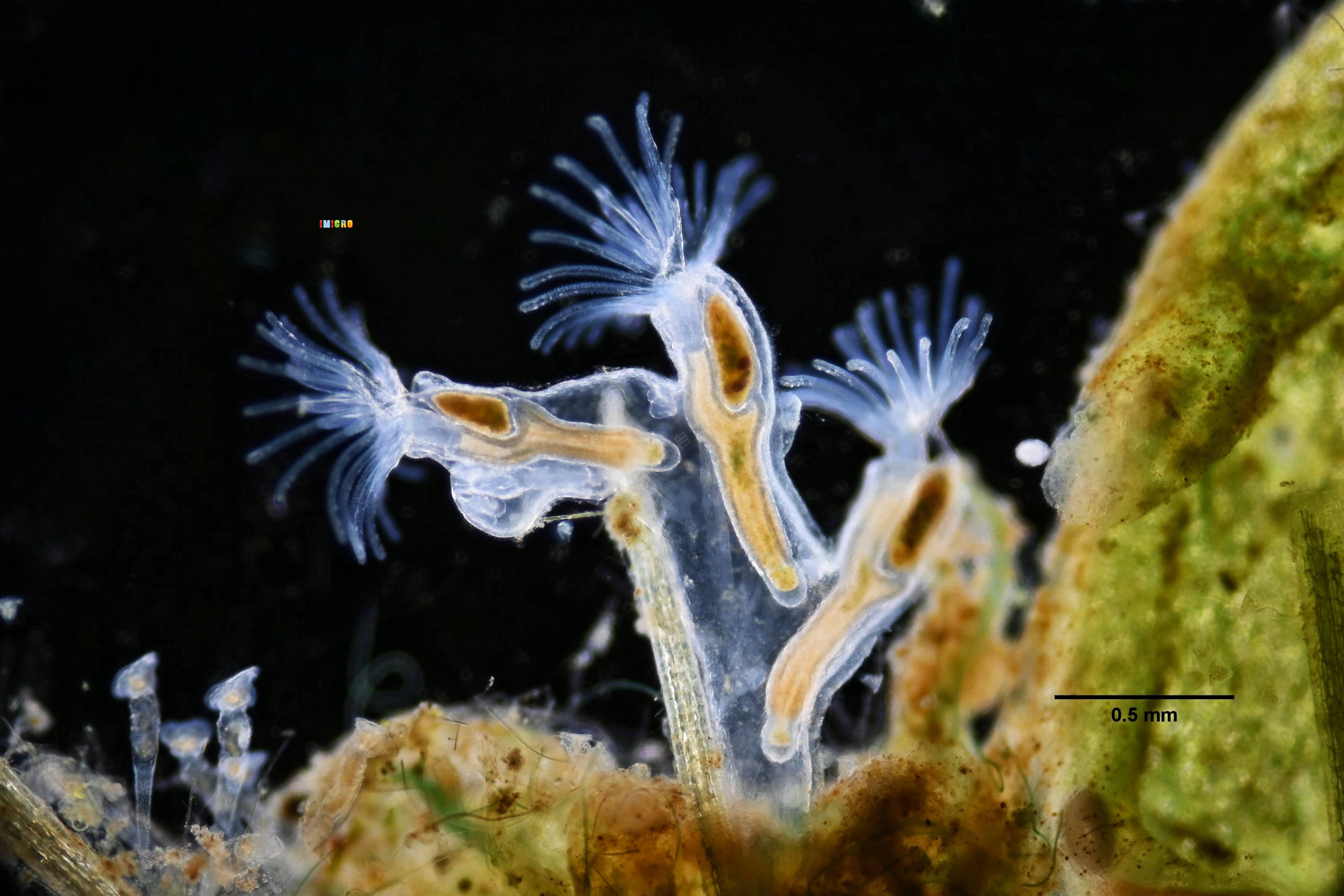 野采水样中不仅有大量浮游生物,在浮水植物叶片背面以及根茎上也固着生长着许多不同生物,形成了一个微型生态环境,此为在野采水样中的浮萍背面叶片及根须区域生长的苔藓虫,左下为一小团固着生长的轮虫,在体视显微镜下将这一小片区域切割分离后转至载玻片,加盖玻片后通过生物显微镜暗场观察拍摄。