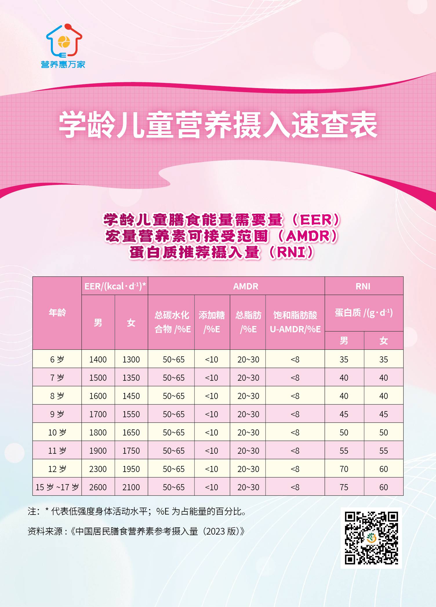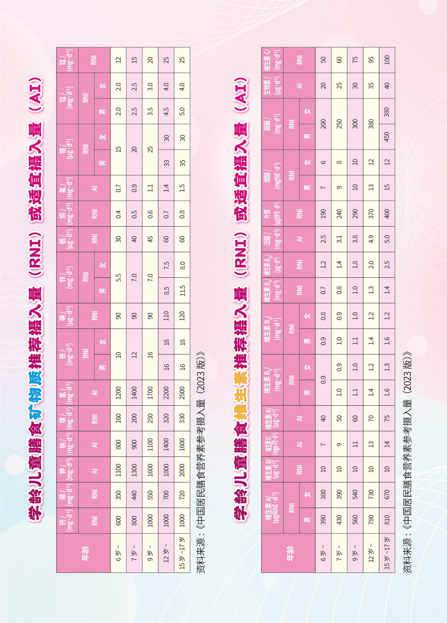 快速了解一下“学龄儿童膳食能量需要量”、“宏量营养素可接受范围”、“蛋白质推荐摄入量”、“膳食矿物质及维生素推荐摄入量或适宜摄入量”吧。