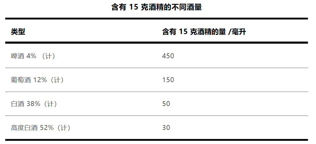 注意每天的酒精摄入量不超过15克[9],相当于啤酒(4%)450ml,葡萄酒(12%)150ml,白酒(38%)一两(50ml),高度(52%)白酒30ml。