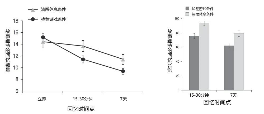 3.测试环节:参与者需要在听完故事的15~30分钟和1周后,分别回忆两个故事的细节信息。