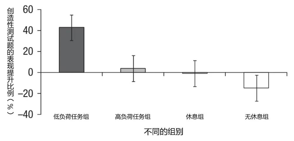 最后,这些参与者都需要再次完成该创造性测试题,看看他们相对于之前是否有进步。结果发现,低认知负荷组的进步最大,高认知负荷组和休息组之间没有明显的差别,都跟之前的表现差不多,而继续“死磕”题目的无休息组反而退步了不少。[3]