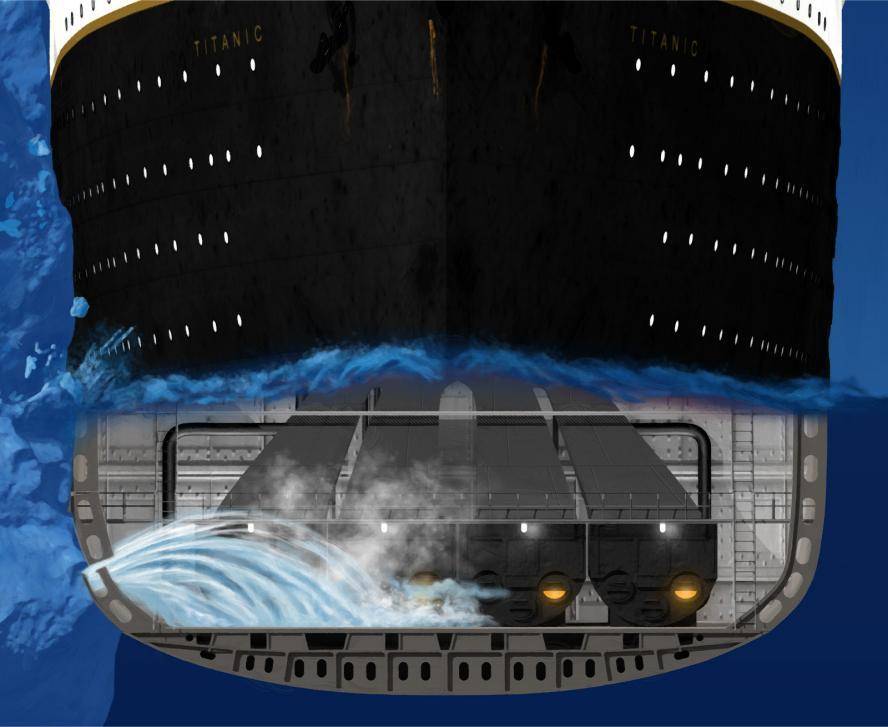 泰坦尼克号拥有16个水密舱室,在最多4个舱室进水的前提下,船才能保持漂浮。撞到冰山后,船首受损,前部五个舱室出现进水,超过设计极限的进水舱室数量很快就把船往下拉。