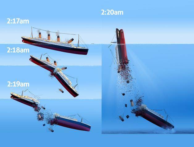 科学家后来发现,海水之所以能快速流入船内,是因为冰山在船体造成许多细长裂缝,而非最初认定的单一大裂口。研究显示,固定船体的铆钉质量不达标,这让泰坦尼克号加速沉没。