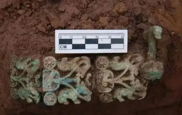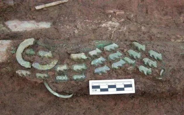 此外,考古人员还在龟甲附近发现了两件青铜腰带,一件腰带为镂空的两马拉车造型,这是巴蜀地区首次发现该风格的腰带;另一件腰带上则镶嵌了猪样装饰。