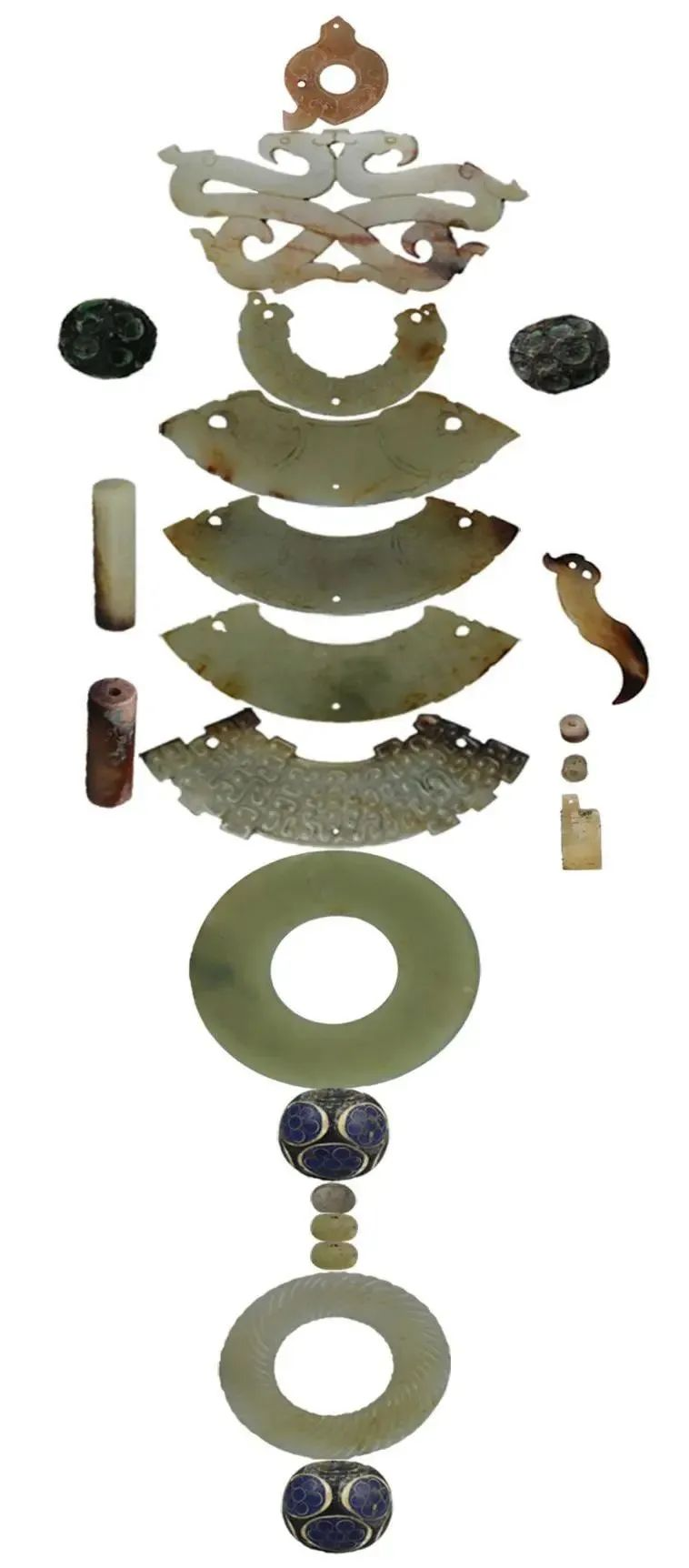 这套玉组佩出土于涪陵小田溪M12号墓,出土时用于穿系的细绳早已腐朽,呈零乱散布状,考古学家和文物专家根据文物出土摆放排序和重叠位置,查阅相关文献资料,力图还原出组佩的本来面貌。