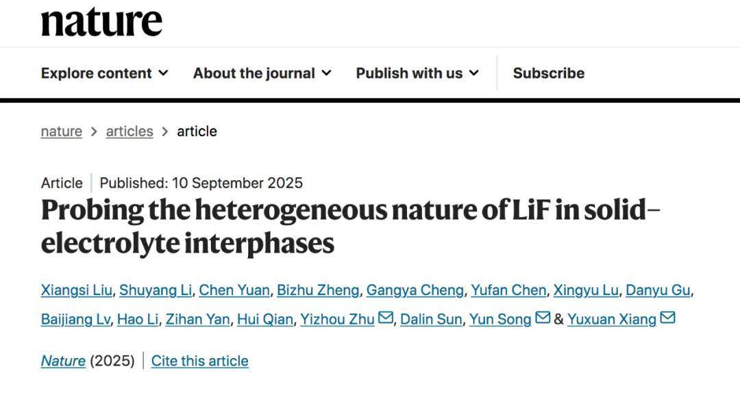 北京时间9月10日23时,西湖大学工学院向宇轩课题组与朱一舟课题组合作,在Nature杂志发表了题为“Probing the Heterogeneous Nature of LiF in Solid-Electrolyte Interphases”的最新研究成果。他们在二次电池电极—电解质界面研究中取得关键突破:发现电池负极保护膜中的关键物质——氟化锂(LiF),不是“纯”的。