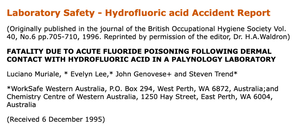 1996 年,西澳大利亚工作安全局的工作人员在英国《职业卫生年鉴》报告了一起发生在孢粉学实验室的浓氢氟酸致死事故。