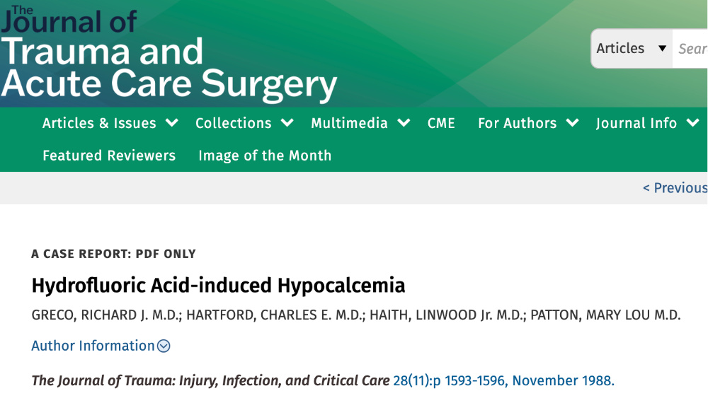 实际上,早在1988年,匹兹堡大学的研究人员已经在一篇名为《氢氟酸引起的低钙血症》的研究中指出,浓氢氟酸造成的伤口,即使面积仅占体表面积的 2.5%,也能在 2 至 3 小时内引发可能致命的低钙血症。