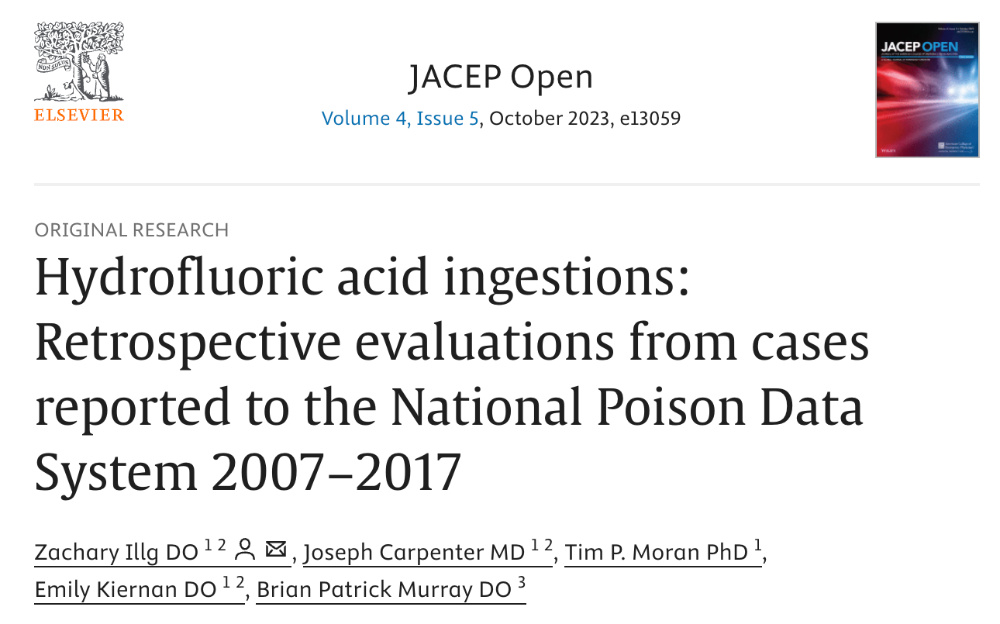2023年,美国埃默里大学医学院急诊医学系的研究人员做了一项关于氢氟酸中毒报告案例的回顾性评估,通过分析2007 年至2017年10 年间美国国家中毒数据系统(NPDS)收到的653 例氢氟酸中毒案例(其中 142 例纳入最终数据分析),得出结论:45.8% 的氢氟酸中毒案例导致了严重后果;6.3%的案例死亡;近一半的氢氟酸暴露(46.5%)是由于将氢氟酸转移到了未贴标签的储存容器中;让人意外的是,最常见的氢氟酸暴露地点是个人住所(78.2%),其次是工作场所(16.2%)。