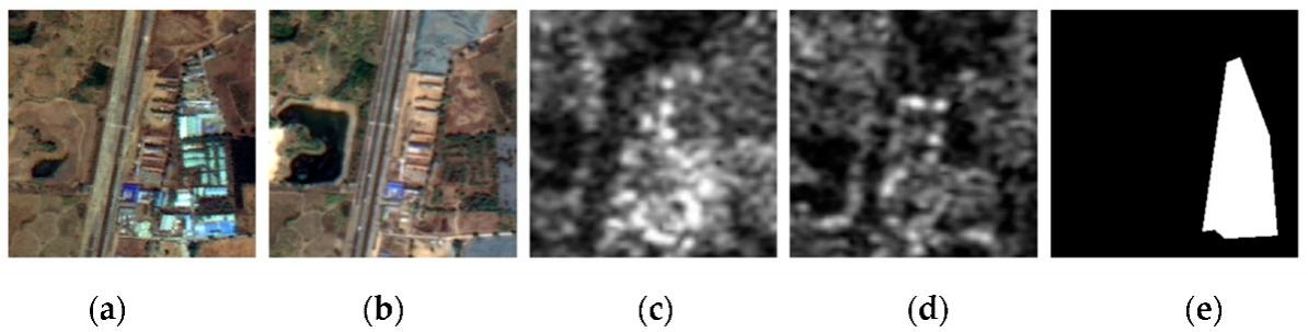(a)、(b)为建筑发生变化前后的光学遥感图像;(c)、(d)为建筑发生变化前后的SAR图像;(e)为建筑发生变化的区域范围。
