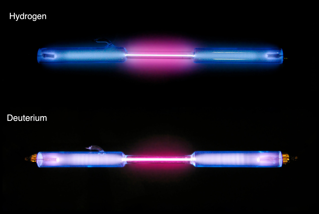 氢气(上)与氘气(下)在气体放电管中发光,分别呈现不同的光学及谱线特征。探测彗星中的氘氢比原理与之类似,仪器将探测其不同的谱线特征来确定氢同位素的种类与相对含量。