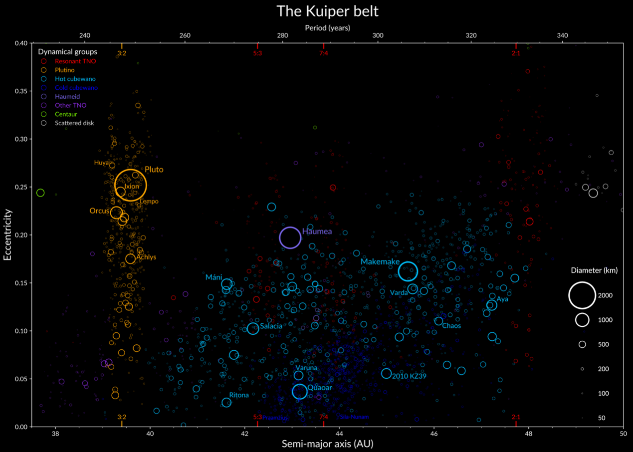 柯伊伯带的半长轴与偏心率结构。橙色表示冥卫一类天体(Plutinos),红色表示其他共振天体。天蓝色表示非共振的“热古柏带天体”,深蓝色表示“冷古柏带天体”。板蓝色部分为妊神星(Haumea)碰撞族。图中标注了若干重要天体。