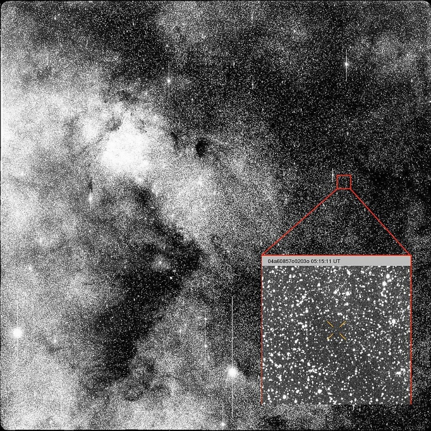 3I/ATLAS 被发现时的图像。图中小图放大了它所在的区域,黄色十字标记了它的位置。│图源:ATLAS/University of Hawaii/NASA
