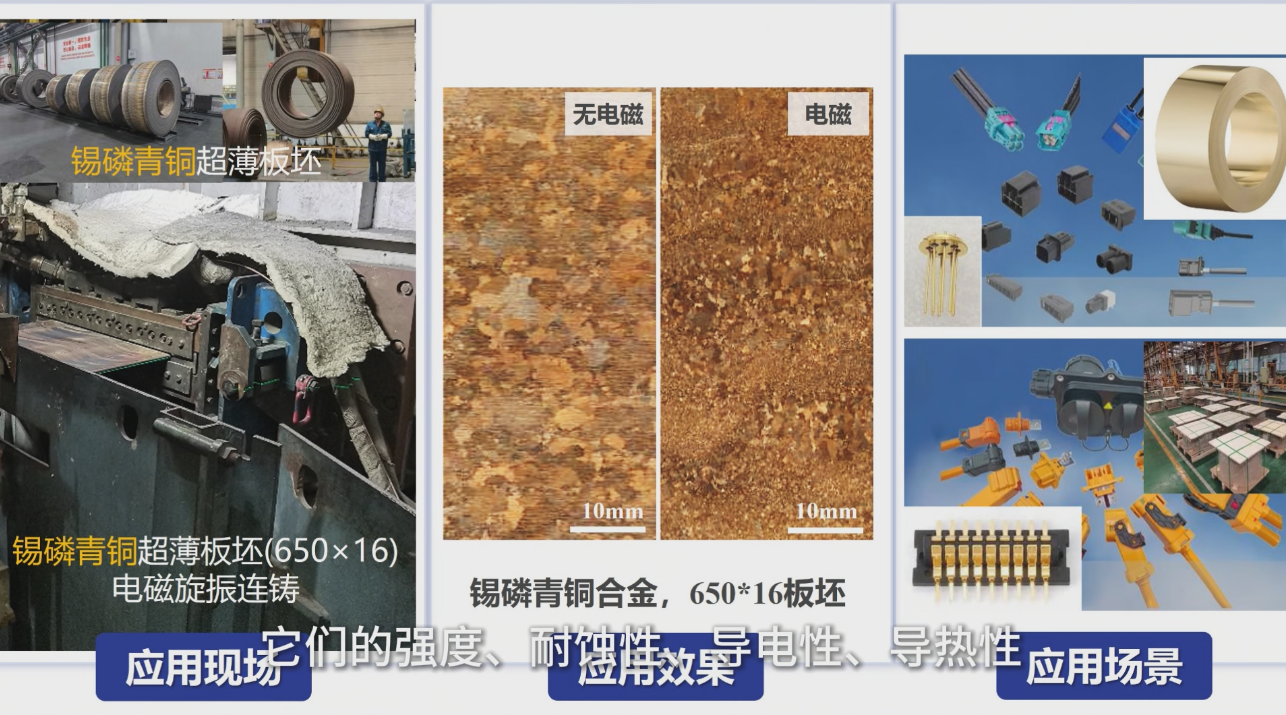 “进入信息与电气化时代,铜的‘命脉’-导电与导热能力,成为关键。但挑战接踵而至:如何让导线承载更大的电流而不发热熔断?如何在轻薄设备中塞入更强大的‘心脏’?“面对这些挑战,科学家们将目光投向合金配方与铸造工艺的双重突破!电磁旋振连铸技术精准驯服金属液流动,抑制偏析、细化晶粒;与此同时,微量的银、铬、锆、稀土元素被精确引入,重塑铜的微观世界。正是尖端工艺与微合金化的这场完美共舞,才催生出新一代‘超级铜合金’!其中,铜-铬-锆合金凭借其卓越的强度与耐热性,正在革新高铁接触网线-在万伏高压与高速摩擦的严苛条件下,它保障电流稳定传输,如同驱动列车疾驰的隐形脉络。铜-镍-锡合金则以优异的抗应力松弛性能,守护着各类关键电气连接的长期可靠性。这些超级材料正成为现代科技的命脉。毫不夸张地说,没有它们,我们的现代科技世界将寸步难行!”