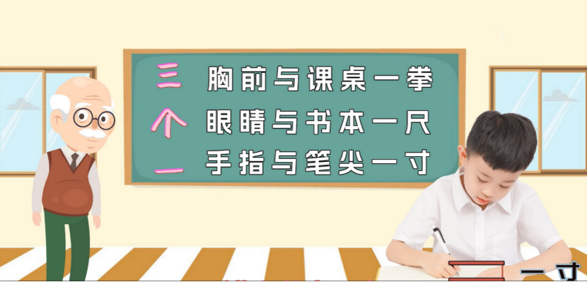 回到家,智慧老人教小明正确的读写姿势:“记住‘三个一’:胸口离桌沿一拳,眼睛离书本一尺(约33厘米),手指离笔尖一寸(约3.3厘米)。”