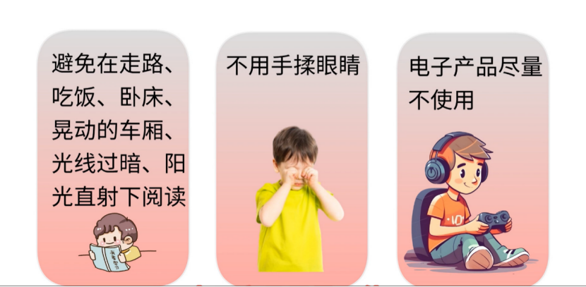 智慧老人补充道:“要避免在走路、吃饭、躺卧、晃动的车厢内,以及光线过暗或阳光直射下看书或使用电子产品。尽量使用LED护眼灯,注意不要用手揉眼睛,以免细菌感染。非学习目的使用电子产品,每次不宜超过20分钟,小学生每天累计不超过2小时,中学生每天不超过3小时,睡前1小时内应避免使用。”