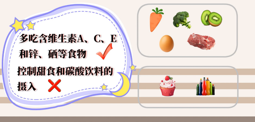 智慧老人告诉小明,饮食对眼睛健康也很重要:“多吃富含维生素A、C、E和锌、硒的食物,如胡萝卜、西兰花、猕猴桃、鸡蛋、瘦肉等,同时控制甜食和碳酸饮料的摄入。”研究还表明,紫色和黄色系果蔬中含有丰富的花青素和叶黄素,对保护视力有益。
