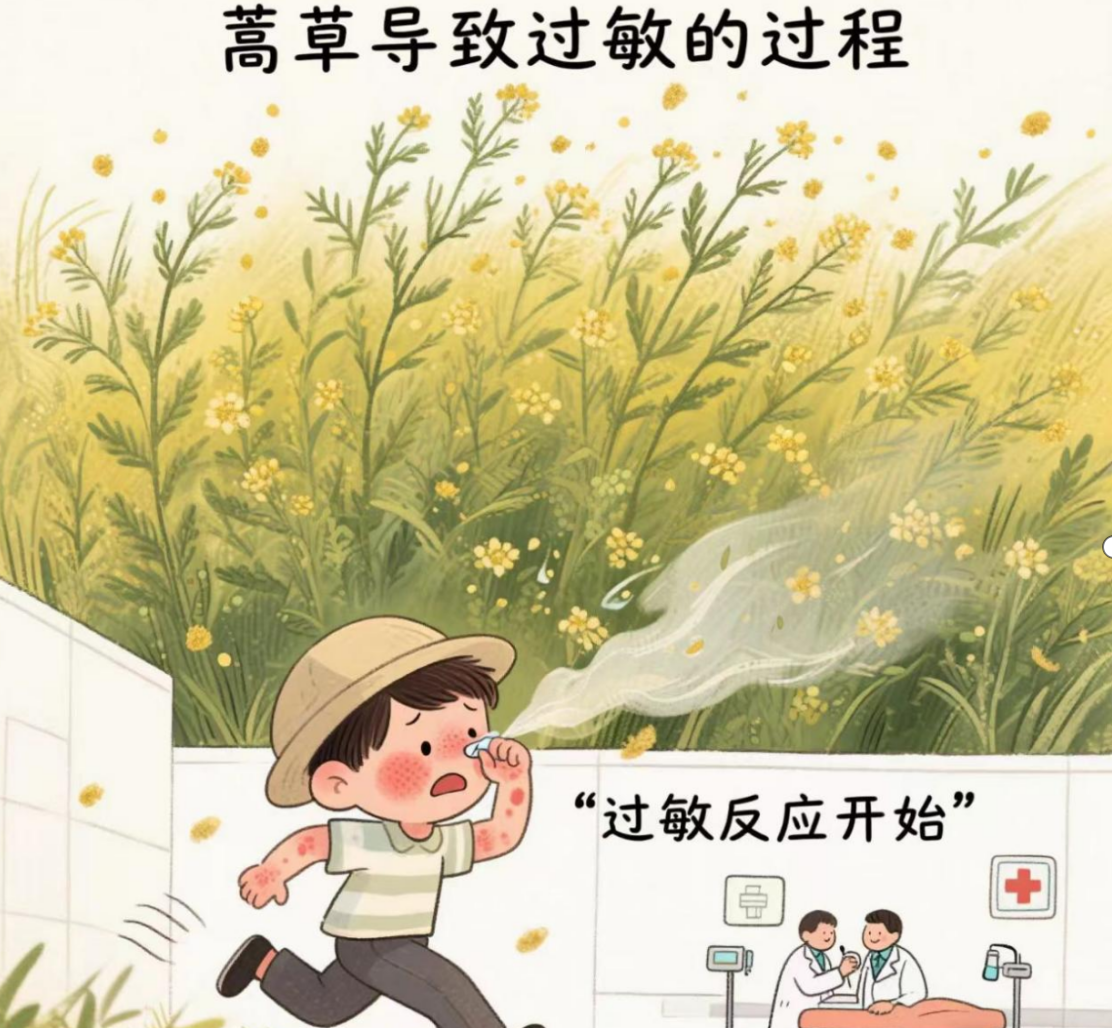 蒿草,隶属于菊科蒿属,种类繁多,如黄花蒿、青蒿、艾蒿等,尤其在我国北方地区广泛生长。每到夏秋季,蒿草茂盛,花粉量大且轻盈,借助风力四处飘散,这些微小的花粉颗粒一旦被儿童吸入呼吸道,极易引发过敏反应[1]。