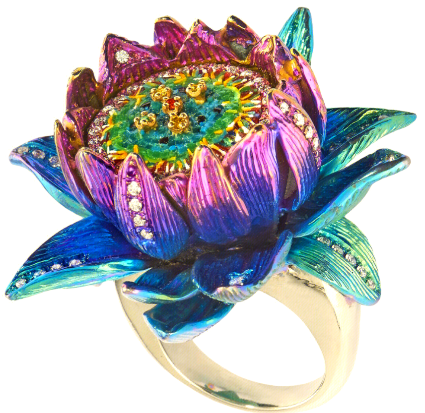 首先是钛,它从外观上看,它和钢有点像,散发着银灰色的光泽。钛的密度比较低,相对密度只有4.5,黄金的相对密度是19.3,铂金是21.5,这意味着同样大小的体积钛的重量仅为传统贵金属的四分之一左右。不仅如此,钛金属还能通过表面处理工艺呈现出丰富的色彩,从白色到墨绿,从紫色到黑色,应有尽有,给珠宝设计师们带来了无尽的创作灵感。另外,钛金属具有较高的“生物相容性”,不会被人体排斥。钛同时是国家高端制造领域的战略性关键金属,其高强度、低密度、抗腐蚀特性使其成为航空航天、深海装备及医疗植入器械的核心材料。