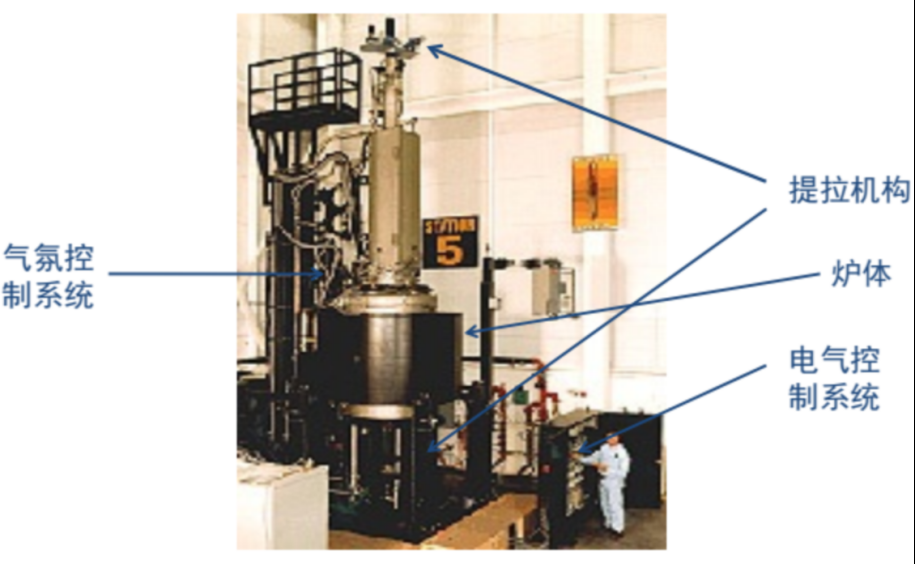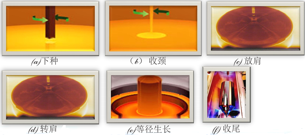 这一步将“多晶硅”拉成原子排列完全一致的“单晶硅”。先加热至1500℃将多晶硅熔化,再将一根直径0.5厘米、长约10厘米的籽晶浸入熔融的硅中,接触到籽晶的熔融态的硅冷却结晶,随着籽晶缓慢地向上提拉,熔融的硅会以籽晶的晶体结构为模板冷却结晶,仿佛像是一根不断生长的“圆柱形单晶硅棒”。