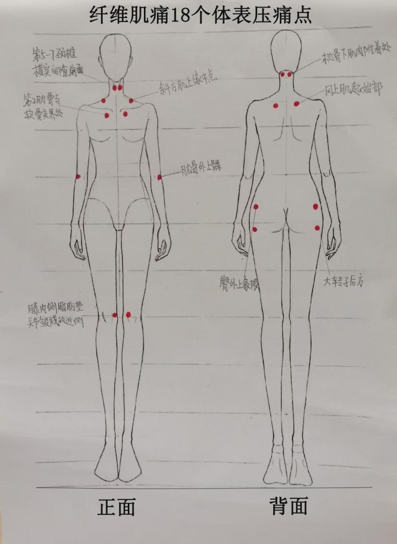 2.压痛:全身对称分布的压痛点,常位于骨突起部位或肌腱、韧带附着点等处,患者对“按压”反应异常敏感,出现痛苦的表情或拒压、后退等反应。压痛点:以拇指按压,压力为4 kg,18个压痛点中至少有11处疼痛。如果出现以下情况时,建议及时就医。