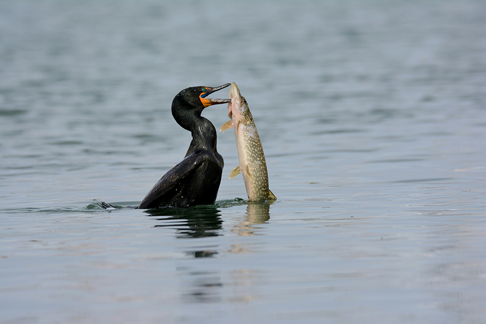当然,作为一种可以长距离飞行的飞鸟,鸬鹚的视力并不差。不过,它的生活区域主要是相对浑浊的内陆淡水区域,因此,在水下,鸬鹚主要依靠自己敏锐的听觉和触觉感受水体震动捕鱼,在接近目标后突然发难。鸬鹚的喙并不像鹤或者翠鸟一样是“标枪”状,而是顶部长有弯钩且较为强壮,可以将滑溜溜的鱼牢牢夹住,避免逃脱。