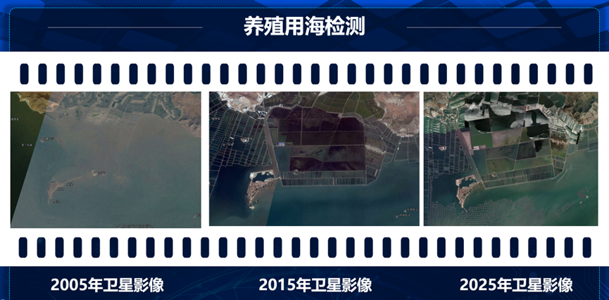 卫星影像也能帮助评估水产养殖的分布与变化。大连是重要的养殖基地,仅长海县面积就超过2000平方公里。通过对比2005年、2015年和2025年的影像,可以清楚看到从沿岸少量养殖逐渐扩展到大规模围海养殖,直到政策限制后,浮筏养殖成为主流。这些资料不仅展现了经济发展与环境的互动,也为科学管理提供数据支撑。