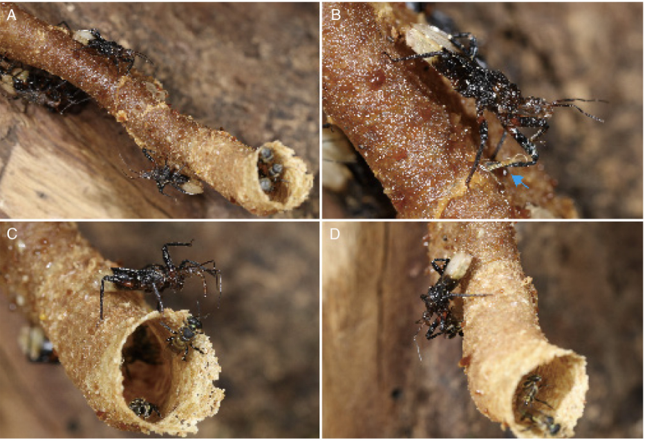 猎蝽在面对这套防御系统之时,展现出令人惊叹的生存策略:猎蝽爬至无刺蜂巢管表面,在发起攻击前用前足蘸取工蜂沉积的树脂(其物理性质类似太妃糖),随后像涂抹护手霜般将树脂均匀涂满前足与中足的股节上。接着,它在巢管入口处抬起涂有树脂的前足严阵以待,待无刺蜂前来攻击时以迅雷之势猛扑,成功捕获后迅速撤离。