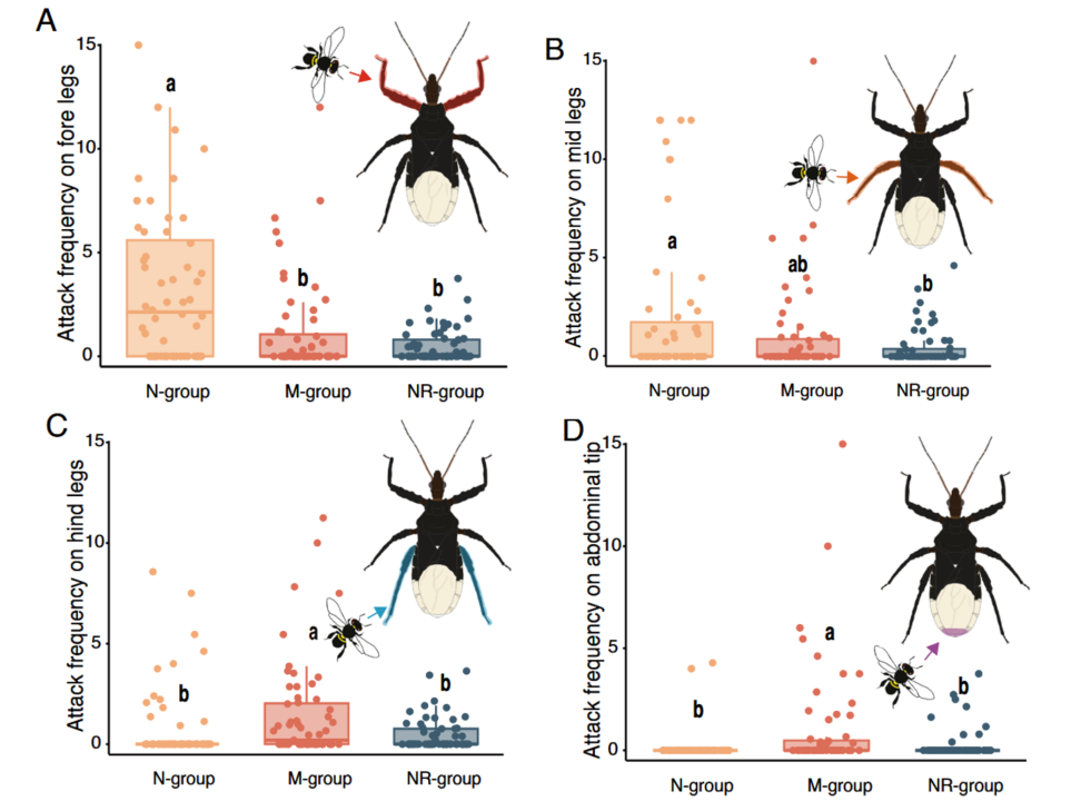 为了解析猎蝽这一独特行为背后的机制,实验者通过严格的控制实验进行了验证,猎蝽在实验中被分为三组:自然组N自主在前、中腿涂抹树脂,操作组M由人工在后腿和腹尖涂抹树脂(前中腿不涂),无树脂组NR则完全不接触树脂。
