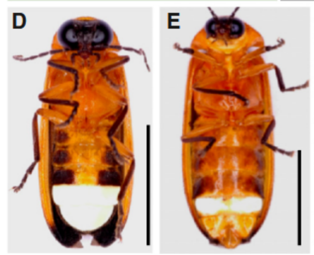 左为雄萤火虫的腹面观,显示其腹部的两个发光器;右为雌萤火虫的腹面观,其腹部有一个发光的发光器。