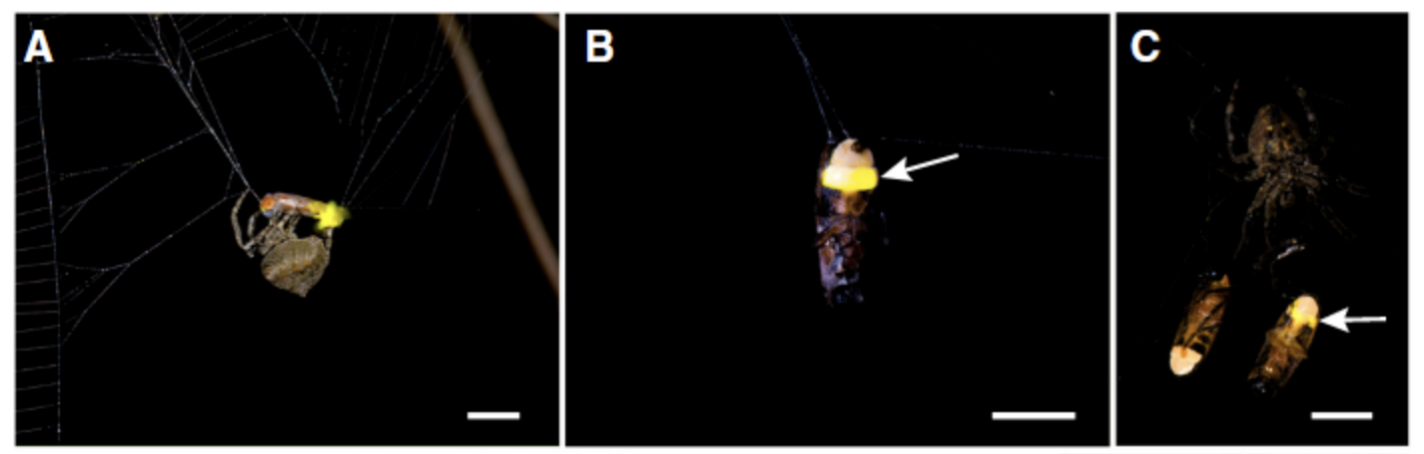 (A)蜘蛛正在缠绕雄萤火虫,其发光器发出可见的闪光。(B)无蜘蛛的网中被困的雄萤火虫,其两个发光器中的一个发光(箭头所示)。(C)蜘蛛与两只被困的雄萤火虫,其中一只具有发光的发光器(箭头所示)。
