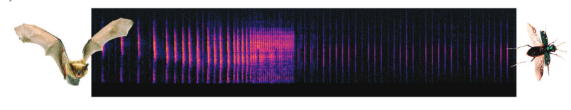 实验中回放的回声定位攻击的频谱图(左),以及虎甲Ellipsoptera marutha(右)产生的超声波响应。